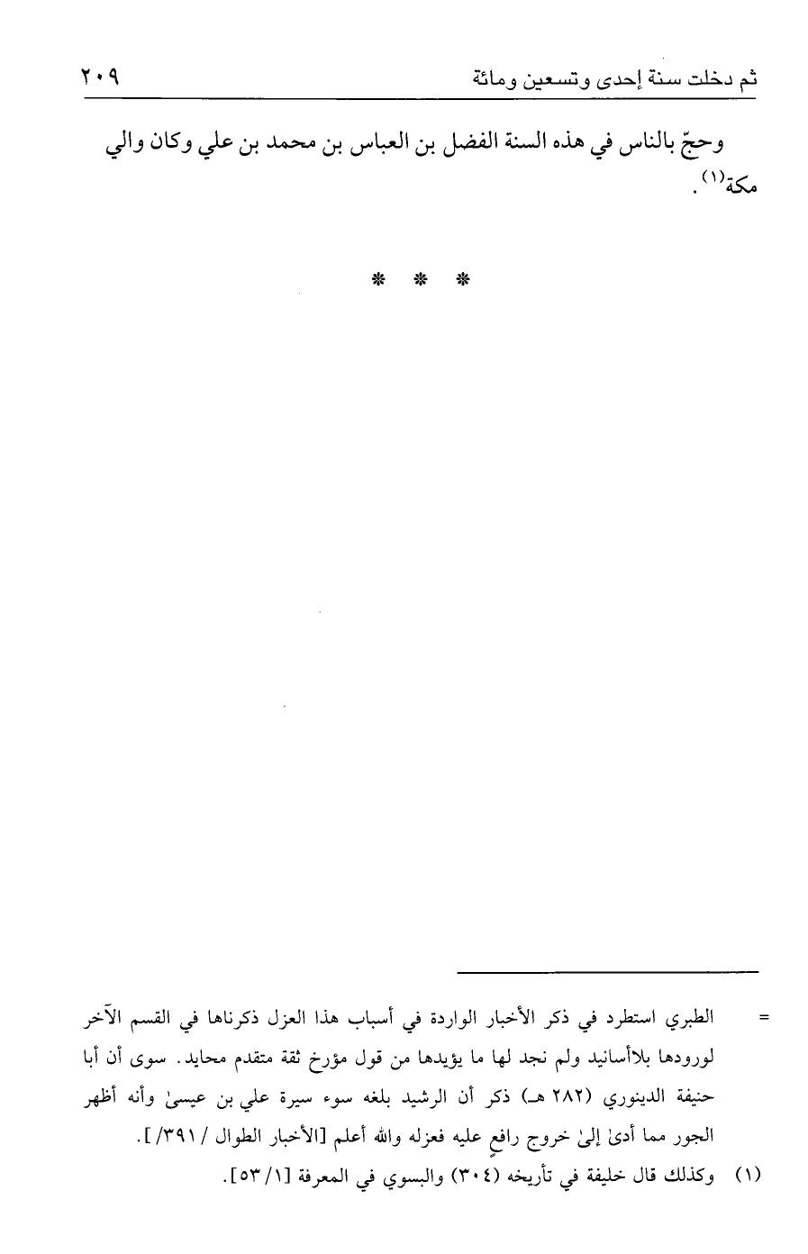 = الطبري استطرد في ذكر الأخبار الواردة في أسباب هذا العزل ذكرناها في القسم الآخر لورودها بلا أسانيد ولم نجد لها ما يؤيدها من قول مؤرخ ثقة متقدم محايد. سوى أن أبا حنيفة الدينوري (٢٨٢ هـ) ذكر أن الرشيد بلغه سوء سيرة علي بن عيسى وأنه أظهر الجور مما أدى إلى خروج رافع عليه فعزله والله أعلم [الأخبار الطوال / ٣٩١ /].