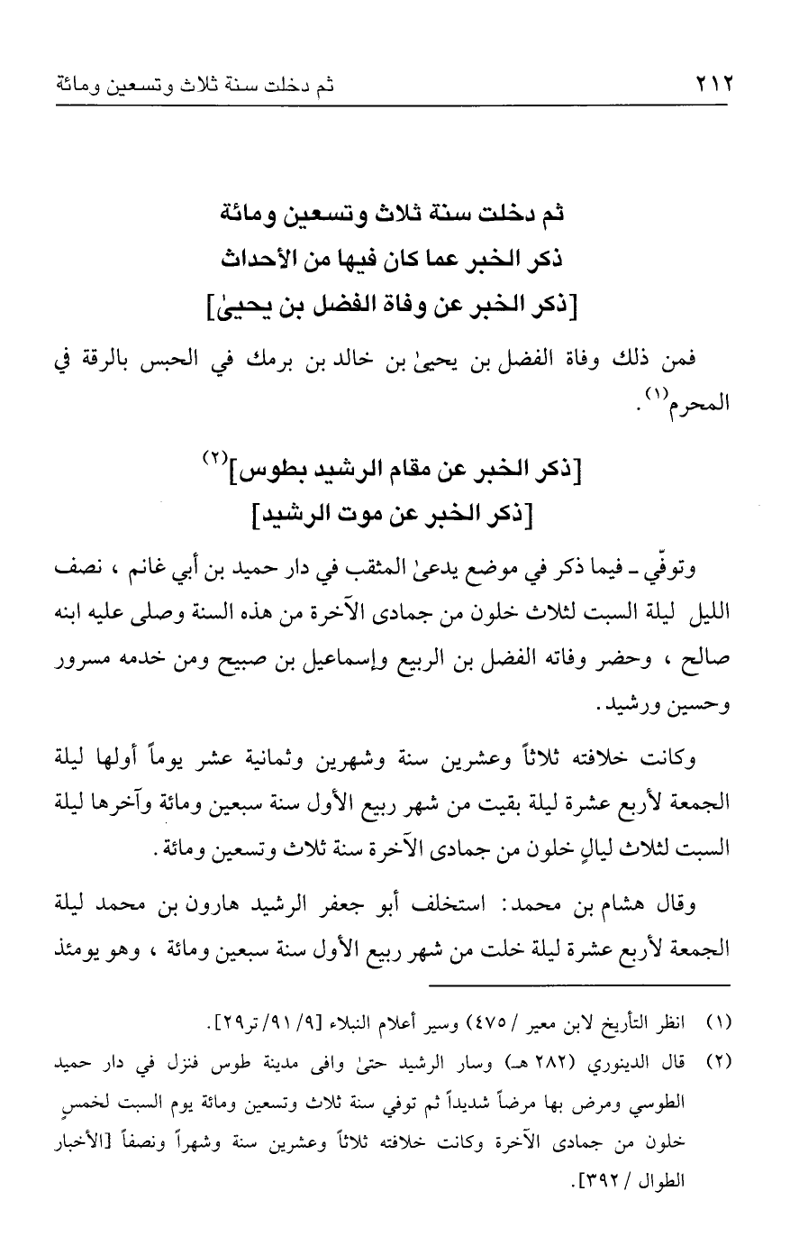(٢) قال الدينوري (٢٨٢ هـ) وسار الرشيد حتى وافى مدينة طوس فنزل في دار حميد الطوسي ومرض بها مرضًا شديدًا ثم توفي سنة ثلاث وتسعين ومائة يوم السبت لخمسٍ خلون من جمادى الآخرة وكانت خلافته ثلاثًا وعشرين سنة وشهرًا ونصفًا [الأخبار الطوال / ٣٩٢].