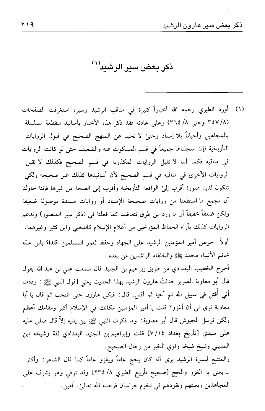 والمتتبع لسيرة الرشيد يرى أنه كان يحج عامًا ويغزو عامًا كما قال الشاعر: وأكثر ما يعني به الغزو والحج [صحيح تأريخ الطبري ٨/ ٢٣٤] وقد توفي وهو يشرف على المجاهدين ويعبئهم ويقودهم في تخوم خراسان فرحمه الله تعالى. آمين. =