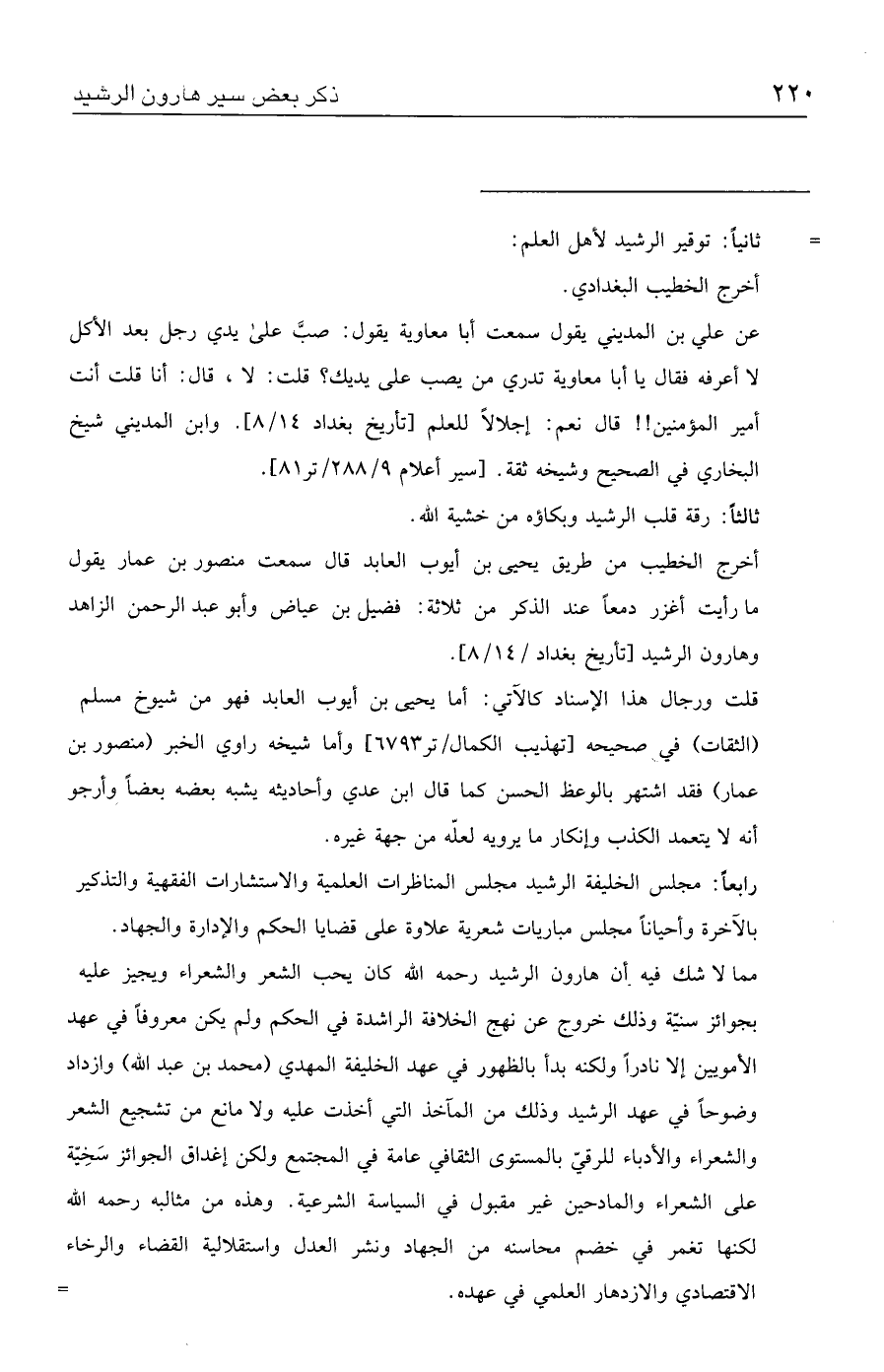 أخرج الخطيب من طريق يحيى بن أيوب العابد قال سمعت منصور بن عمار يقول ما رأيت أغزر دمعًا عند الذكر من ثلاثة: فضيل بن عياض وأبو عبد الرحمن الزاهد وهارون الرشيد [تأريخ بغداد / ١٤/ ٨].