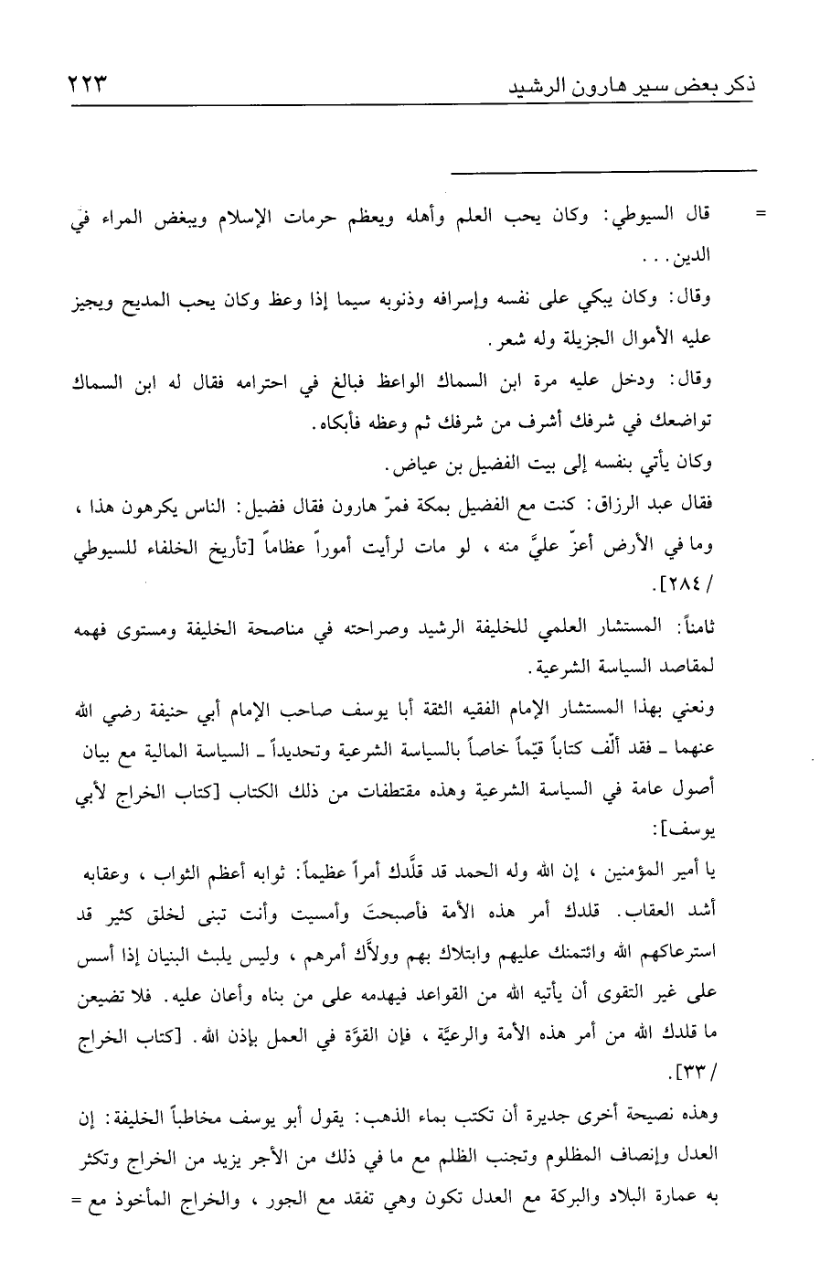 ونعني بهذا المستشار الإمام الفقيه الثقة أبا يوسف صاحب الإمام أبي حنيفة رضي الله عنهما - فقد ألّف كتابًا قيّمًا خاصًّا بالسياسة الشرعية وتحديدًا - السياسة المالية مع بيان أصول عامة في السياسة الشرعية وهذه مقتطفات من ذلك الكتاب [كتاب الخراج لأبي يوسف]: