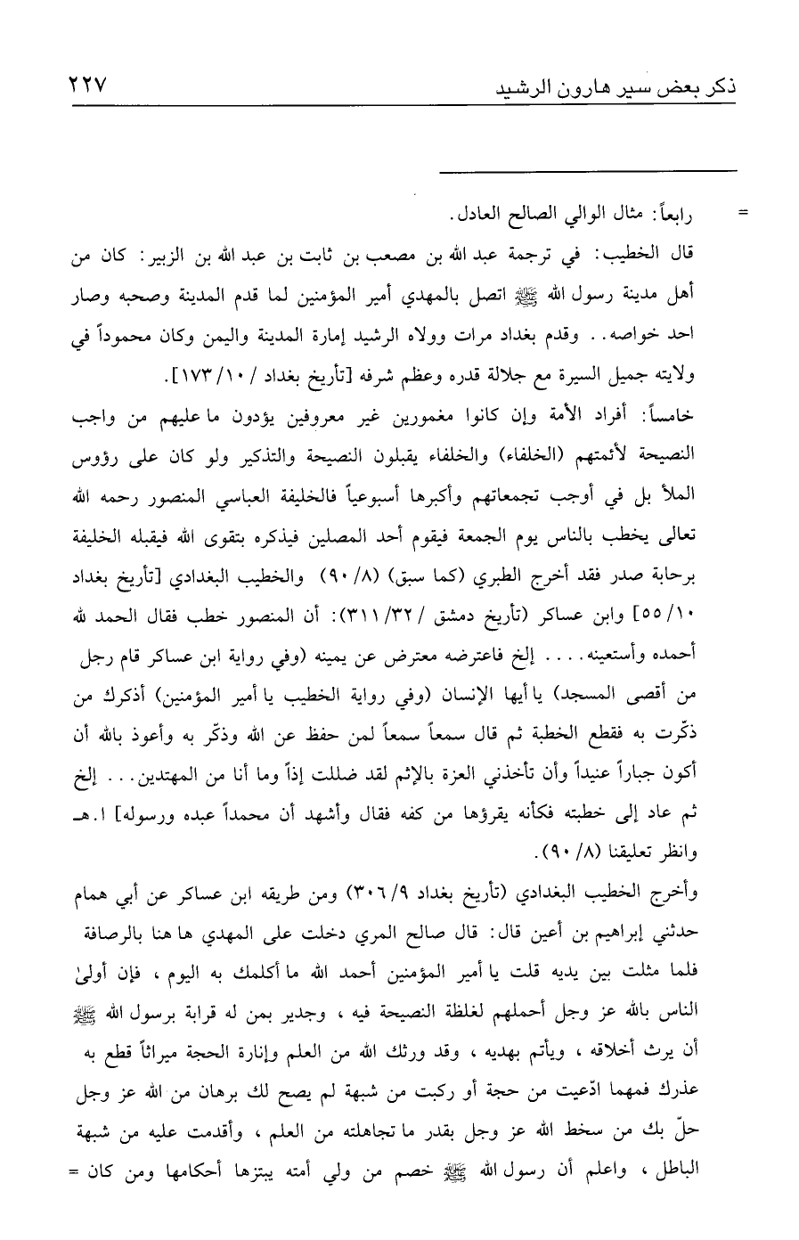 خامسًا: أفراد الأمة وإن كانوا مغمورين غير معروفين يؤدون ما عليهم من واجب النصيحة لأئمتهم (الخلفاء) والخلفاء يقبلون النصيحة والتذكير ولو كان على رؤوس الملأ بل في أوجب تجمعاتهم وأكبرها أسبوعيًا فالخليفة العباسي المنصور رحمه الله تعالى يخطب بالناس يوم الجمعة فيقوم أحد المصلين فيذكره بتقوى الله فيقبله الخليفة برحابة صدر فقد أخرج الطبري (كما سبق) (٨/ ٩٠) والخطيب البغدادي [تأريخ بغداد ١٠/ ٥٥، وابن عساكر (تأريخ دمشق / ٣٢/ ٣١١): أن المنصور خطب فقال الحمد لله أحمده وأستعينه .... إلخ فاعترضه معترض عن يمينه (وفي رواية ابن عساكر قام رجل من أقصى المسجد) يا أيها الإنسان (وفي رواية الخطيب يا أمير المؤمنين) أذكرك من ذكّرت به فقطع الخطبة ثم قال سمعًا سمعًا لمن حفظ عن الله وذكّر به وأعوذ بالله أن أكون جبارًا عنيدًا وأن تأخذني العزة بالإثم لقد ضللت إذًا وما أنا من المهتدين ... إلخ ثم عاد إلى خطبته فكأنه يقرؤها من كفه فقال وأشهد أن محمدَّا عَبده ورسوله] ا. هـ وانظر تعليقنا (٨/ ٩٠).