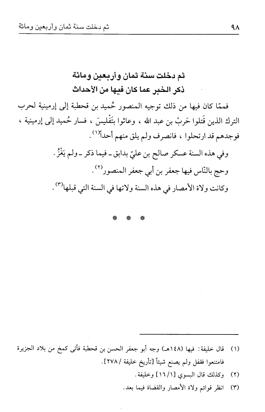 (١) قال خليفة: فيها (١٤٨ هـ) وجه أبو جعفر الحسن بن قحطبة فأتى كمخ من بلاد الجزيرة فامتنعوا فقفل ولم يصنع شيئًا [تأريخ خليفة / ٢٧٨].