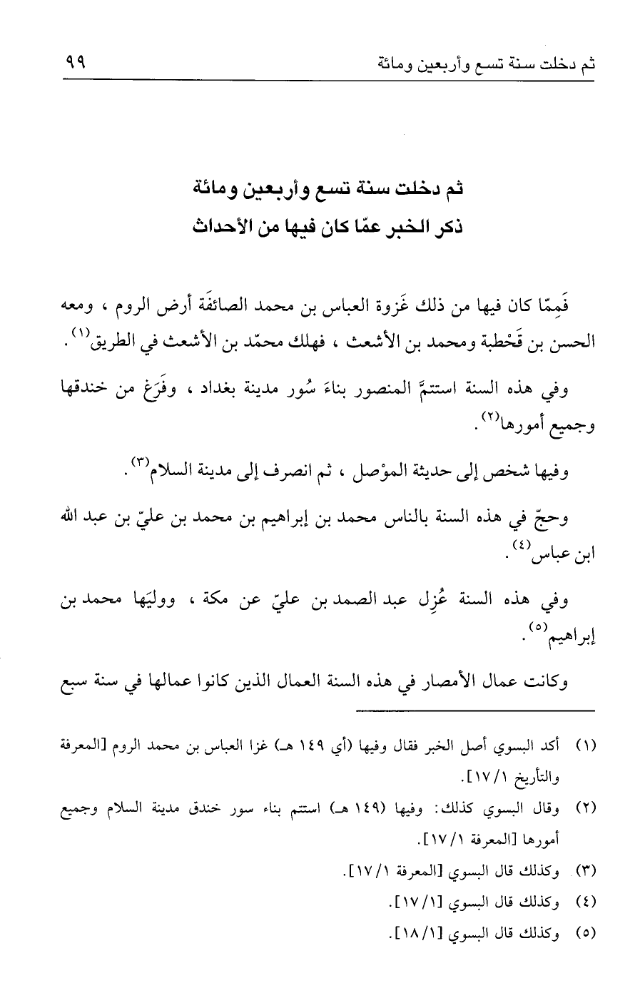 (٢) وقال البسوي كذلك: وفيها (١٤٩ هـ) استتم بناء سور خندق مدينة السلام وجميع أمورها [المعرفة ١/ ١٧].