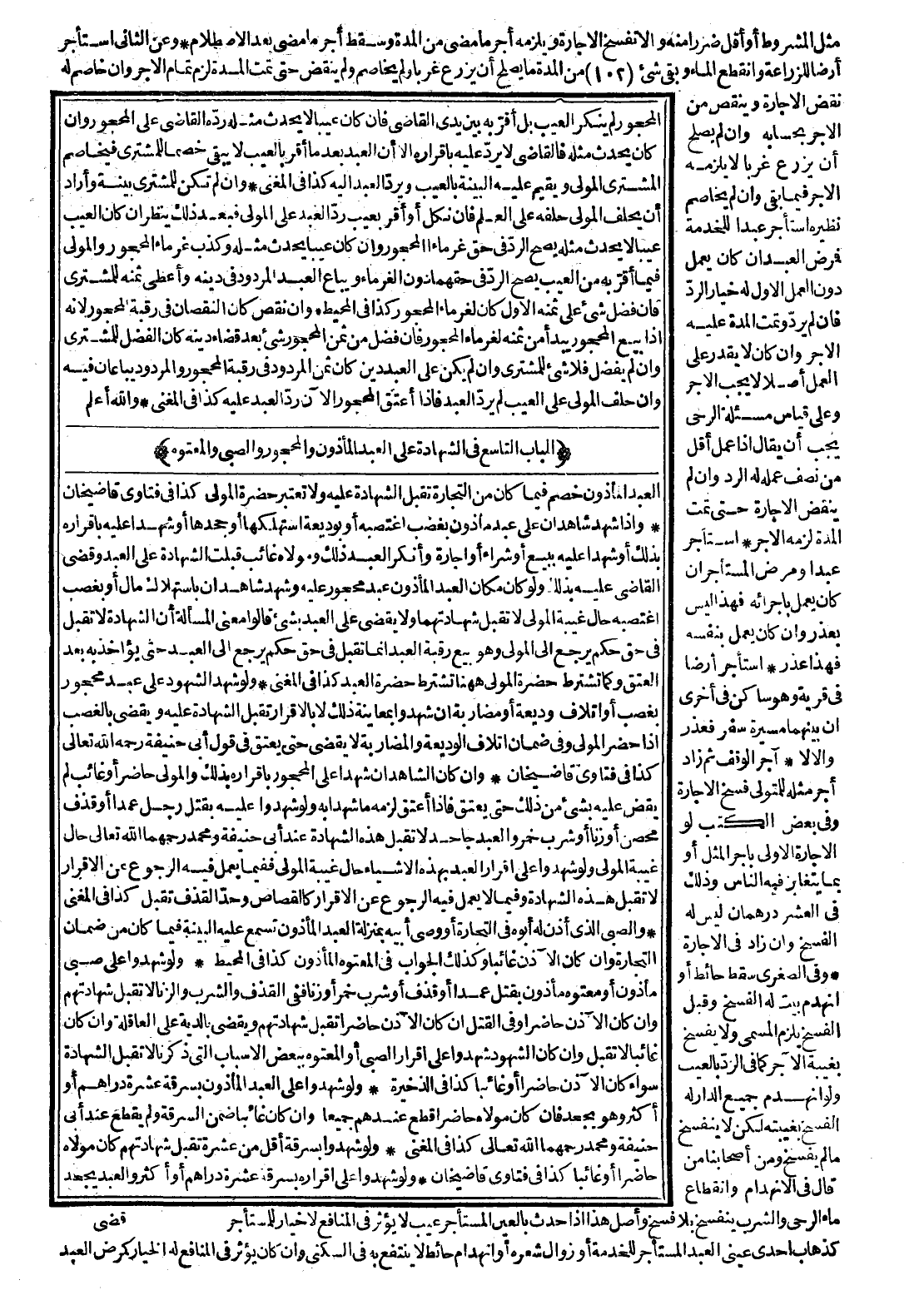 (الْبَابُ التَّاسِعُ فِي الشَّهَادَةِ عَلَى الْعَبْدِ الْمَأْذُونِ وَالْمَحْجُورِ وَالصَّبِيِّ وَالْمَعْتُوهِ) الْعَبْدُ الْمَأْذُونُ خَصْمٌ فِيمَا كَانَ مِنْ التِّجَارَةِ تُقْبَلُ الشَّهَادَةُ عَلَيْهِ، وَلَا تُعْتَبَرُ حَضْرَةُ الْمَوْلَى كَذَا فِي فَتَاوَى قَاضِي خَانْ، وَإِذَا شَهِدَ شَاهِدَانِ عَلَى عَبْدٍ مَأْذُونٍ بِغَصْبٍ اغْتَصَبَهُ أَوْ بِوَدِيعَةٍ اسْتَهْلَكَهَا أَوْ جَحَدَهَا أَوْ شَهِدَا عَلَيْهِ بِإِقْرَارِهِ بِذَلِكَ أَوْ شَهِدَا عَلَيْهِ بِبَيْعٍ أَوْ شِرَاءِ أَوْ إجَارَةٍ، وَأَنْكَرَ الْعَبْدُ ذَلِكَ، وَمَوْلَاهُ غَائِبٌ قُبِلَتْ الشَّهَادَةُ عَلَى الْعَبْدِ وَقَضَى الْقَاضِي عَلَيْهِ بِذَلِكَ، وَلَوْ كَانَ مَكَانَ الْعَبْدِ الْمَأْذُونِ عَبْدٌ مَحْجُورٌ عَلَيْهِ، وَشَهِدَ شَاهِدَانِ بِاسْتِهْلَاكِ مَالٍ أَوْ بِغَصْبٍ اغْتَصَبَهُ حَالَ غَيْبَةِ الْمَوْلَى لَا تُقْبَلُ شَهَادَتُهُمَا، وَلَا يَقْضِي عَلَى الْعَبْدِ بِشَيْءٍ قَالُوا: مَعْنَى الْمَسْأَلَةِ أَنَّ الشَّهَادَةَ لَا تُقْبَلُ فِي حَقِّ حُكْمٍ يَرْجِعُ إلَى الْمَوْلَى، وَهُوَ بَيْعُ رَقَبَةِ الْعَبْدِ إنَّمَا تُقْبَلُ فِي حَقِّ حُكْمٍ يَرْجِعُ إلَى الْعَبْدِ حَتَّى يُؤَاخَذُ بِهِ بَعْدَ الْعِتْقِ وَكَمَا تُشْتَرَطُ حَضْرَةُ الْمَوْلَى هَاهُنَا تُشْتَرَطُ حَضْرَةُ الْعَبْدِ كَذَا فِي الْمُغْنِي.