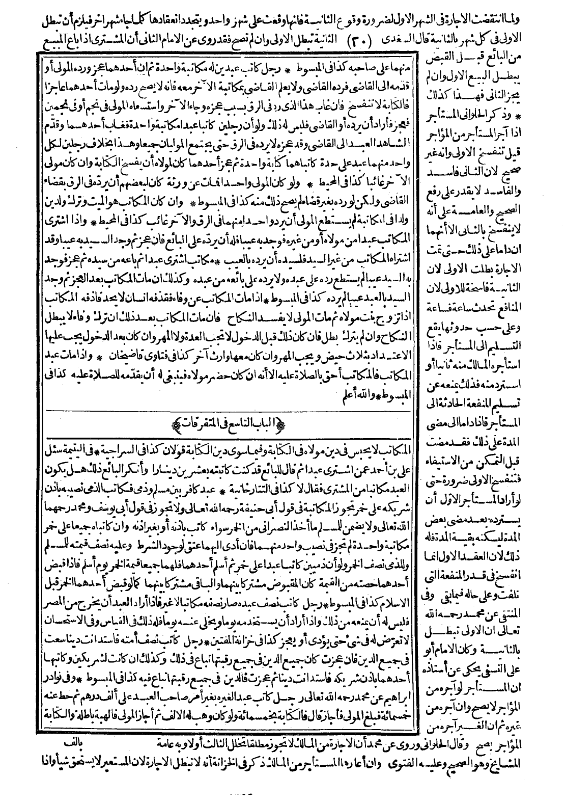 (الْبَابُ التَّاسِعُ فِي الْمُتَفَرِّقَاتِ) الْمُكَاتَبُ لَا يُحْبَسُ فِي دَيْنِ مَوْلَاهُ فِي الْكِتَابَةِ وَفِيمَا سِوَى دَيْنِ الْكِتَابَةِ قَوْلَانِ كَذَا فِي السِّرَاجِيَّةِ.