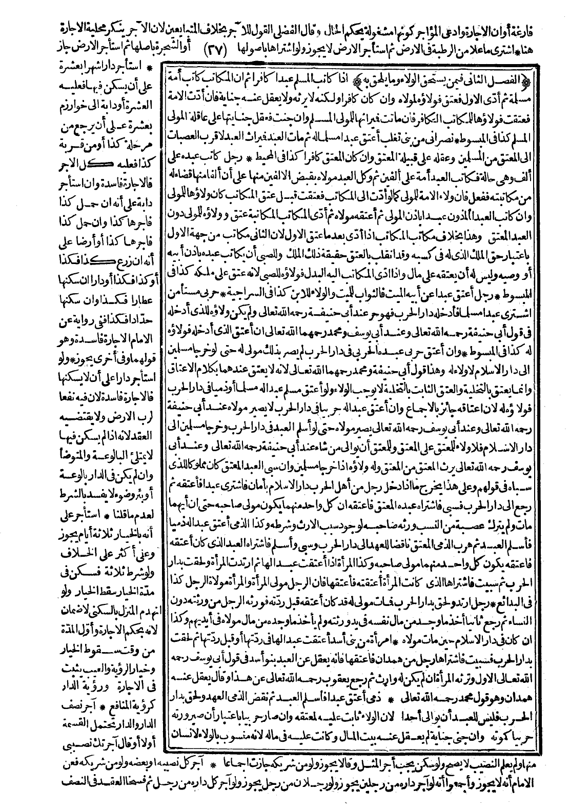 امْرَأَةٌ مِنْ بَنِي أَسَدٍ أَعْتَقَتْ عَبْدًا لَهَا فِي رِدَّتِهَا أَوْ قَبْلَ رِدَّتِهَا ثُمَّ لَحِقَتْ بِدَارِ الْحَرْبِ فَسُبِيَتْ فَاشْتَرَاهَا رَجُلٌ مِنْ هَمْدَانَ فَأَعْتَقَهَا فَإِنَّهُ يَعْقِلُ عَنْ الْعَبْدِ بَنُو أَسَدٍ فِي قَوْلِ أَبِي يُوسُفَ - رَحِمَهُ اللَّهُ تَعَالَى - الْأَوَّلِ، وَتَرِثُهُ الْمَرْأَةُ إنْ لَمْ يَكُنْ لَهُ وَارِثٌ ثُمَّ رَجَعَ يَعْقُوبُ - رَحِمَهُ اللَّهُ تَعَالَى - عَنْ هَذَا، وَقَالَ: يَعْقِلُ عَنْهُ هَمْدَانُ وَهُوَ قَوْلُ مُحَمَّدٌ - رَحِمَهُ اللَّهُ تَعَالَى -.