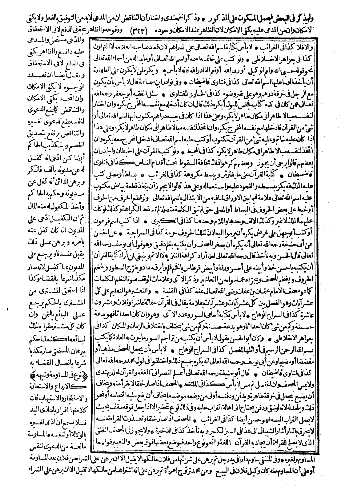 عَنْ الْحَسَنِ عَنْ أَبِي حَنِيفَةَ - رَحِمَهُ اللَّهُ تَعَالَى - أَنَّهُ يُكْرَهُ أَنْ يُصَغَّرَ الْمُصْحَفُ وَأَنْ يَكْتُبَهُ بِقَلَمٍ دَقِيقٍ وَهُوَ قَوْلُ أَبِي يُوسُفَ - رَحِمَهُ اللَّهُ تَعَالَى -، قَالَ الْحَسَنُ وَبِهِ نَأْخُذُ، قَالَ - رَحِمَهُ اللَّهُ تَعَالَى -: لَعَلَّهُ أَرَادَ كَرَاهَةَ التَّنْزِيهِ لَا الْإِثْمَ، وَيَنْبَغِي لِمَنْ أَرَادَ كِتَابَةَ الْقُرْآنِ أَنْ يَكْتُبَهُ بِأَحْسَنِ خَطٍّ وَأَبْيَنِهِ عَلَى أَحْسَنِ وَرَقَةٍ وَأَبْيَضِ قِرْطَاسٍ بِأَفْخَمِ قَلَمٍ وَأَبْرَقِ مِدَادٍ، وَيُفَرِّجَ السُّطُورَ وَيُفَخِّمَ الْحُرُوفَ وَيَضُمَّ الْمُصْحَفَ وَيُجَرِّدَهُ عَمَّا سِوَاهُ مِنْ التَّعَاشِيرِ، وَذِكْرُ الْآيِ وَعَلَامَاتِ الْوَقْفِ صَوْنًا لِنَظْمِ الْكَلِمَاتِ كَمَا هُوَ مُصْحَفُ الْإِمَامِ عُثْمَانَ بْنِ عَفَّانَ - رَضِيَ اللَّهُ تَعَالَى عَنْهُ -، كَذَا فِي الْقُنْيَةِ. وَالتَّعْشِيرُ هُوَ التَّعْلِيمُ عَلَى كُلِّ عَشْرِ آيَاتٍ، وَهُوَ الْفَصْلُ بَيْنَ كُلِّ عَشْرِ آيَاتٍ وَعَشْرِ آيَاتٍ بِعَلَامَةٍ، يُقَالُ: فِي الْقُرْآنِ سِتُّمِائَةِ عَاشِرَةٍ وَثَلَاثٌ وَعِشْرُونَ عَاشِرَةٍ، كَذَا فِي السِّرَاجِ الْوَهَّاجِ.
