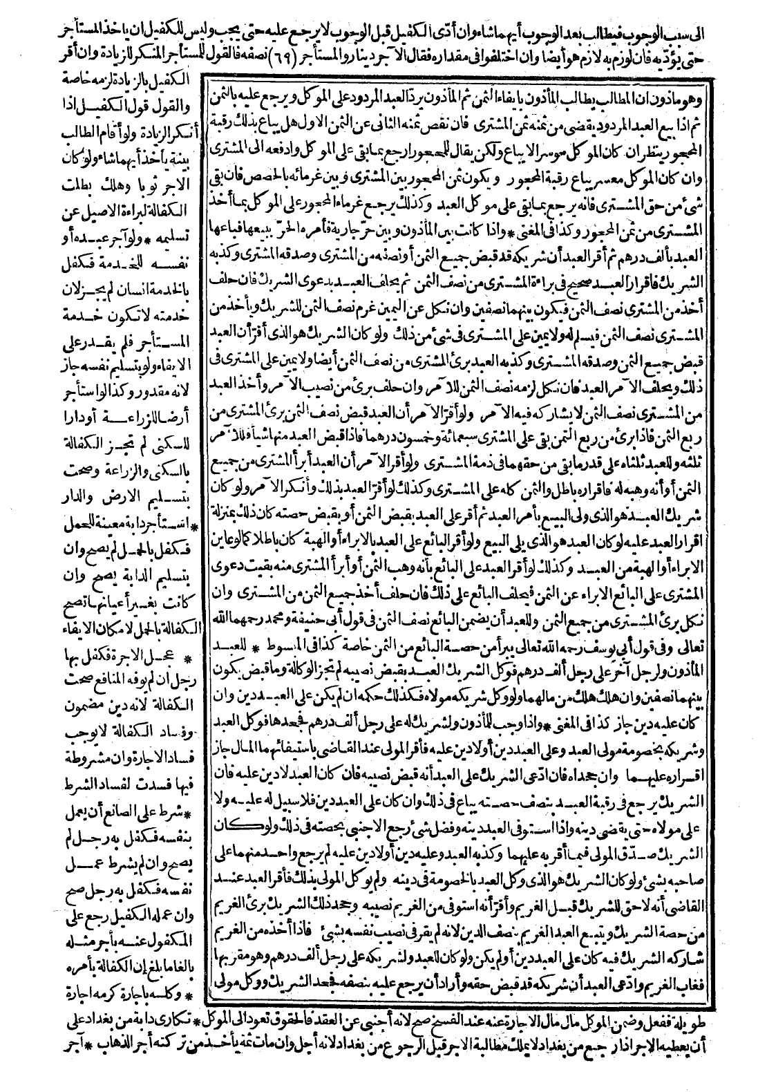 وَإِذَا كَانَتْ بَيْنَ الْمَأْذُونِ وَبَيْنَ حُرٍّ جَارِيَةٌ فَأَمَرَهُ الْحُرُّ بِبَيْعِهَا فَبَاعَهَا الْعَبْدُ بِأَلْفِ دِرْهَمٍ ثُمَّ أَقَرَّ الْعَبْدُ أَنَّ شَرِيكَهُ قَدْ قَبَضَ جَمِيعَ الثَّمَنِ أَوْ نِصْفَهُ مِنْ الْمُشْتَرِي وَصَدَّقَهُ الْمُشْتَرِي، وَكَذَّبَهُ الشَّرِيكُ فَإِقْرَارُ الْعَبْدِ صَحِيحٌ فِي بَرَاءَةِ الْمُشْتَرِي مِنْ نِصْفِ الثَّمَنِ ثُمَّ يَحْلِفُ الْعَبْدُ بِدَعْوَى الشَّرِيكِ فَإِنْ حَلَفَ أَخَذَ مِنْ الْمُشْتَرِي نِصْفَ الثَّمَنِ فَيَكُونُ بَيْنَهُمَا نِصْفَيْنِ، وَإِنْ نَكَلَ عَنْ الْيَمِينِ غَرِمَ نِصْفَ الثَّمَنِ لِلشَّرِيكِ، وَيَأْخُذُ مِنْ الْمُشْتَرِي نِصْفَ الثَّمَنِ فَيَسْلَمُ لَهُ، وَلَا يَمِينَ عَلَى الْمُشْتَرِي فِي شَيْءٍ مِنْ ذَلِكَ، وَلَوْ كَانَ الشَّرِيكُ هُوَ الَّذِي أَقَرَّ أَنَّ الْعَبْدَ قَبَضَ جَمِيعَ الثَّمَنِ، وَصَدَّقَهُ الْمُشْتَرِي، وَكَذَّبَهُ الْعَبْدُ بَرِئَ الْمُشْتَرِي مِنْ نِصْفِ الثَّمَنِ أَيْضًا، وَلَا يَمِينَ عَلَى الْمُشْتَرِي فِي ذَلِكَ وَيُحَلِّفُ الْآمِرُ الْعَبْدَ فَإِنْ نَكَلَ لَزِمَهُ نِصْفُ الثَّمَنِ لِلْآمِرِ، وَإِنْ حَلَفَ بَرِيءَ مِنْ نَصِيبِ الْآمِرِ، وَأَخَذَ الْعَبْدُ مِنْ الْمُشْتَرِي نِصْفَ الثَّمَنِ لَا يُشَارِكُهُ فِيهِ الْآمِرُ، وَلَوْ أَقَرَّ الْآمِرُ أَنَّ الْعَبْدَ قَبَضَ نِصْفَ الثَّمَنِ بَرِئَ الْمُشْتَرِي مِنْ رُبُعِ الثَّمَنِ فَإِذَا بَرِئَ مِنْ رُبُعِ الثَّمَنِ بَقِيَ عَلَى الْمُشْتَرِي سَبْعِمِائَةٍ وَخَمْسُونَ دِرْهَمًا فَإِذَا قَبَضَ الْعَبْدُ مِنْهَا شَيْئًا فَلِلْآمِرِ ثُلُثُهُ وَلِلْعَبْدِ ثُلُثَاهُ عَلَى قَدْرِ مَا بَقِيَ مِنْ حَقِّهِمَا فِي ذِمَّةِ الْمُشْتَرِي.