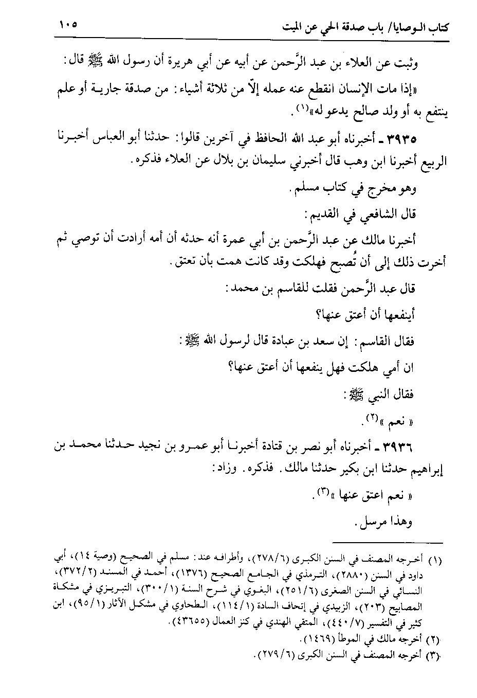 قال عبد الرحمن فقلت للقاسم بن محمد أينفعها أن أعتق عنها ؟ فقال القاسم : إن سعد بن عبادة قال لرسول الله صلى الله عليه وسلم إن أمي هلكت فهل ينفعها أن أعتق عنها ؟ فقال النبي صلى الله عليه وسلم نعم.