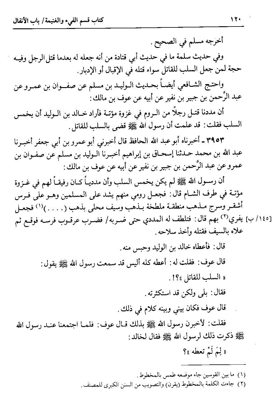 أن رسول الله صلى الله عليه وسلم لم يكن يخمس السلب وأن مددياً كان رفيقاً لهم في غزوة مؤتة في طرف الشام قال : فجعل رومي منهم يشد على المسلمين وهو على فرس أشقر وسرج مذهب منطقة ملطخة بذهب وسيف محلى بذهب ( . . . . . . ) فجعل يفري بهم قال : فتلطف له المددي حتى ضربه فضرب عرقوب فرسه فوقع ثم علاه بالسيف فقتله وأخذ سلاحه.