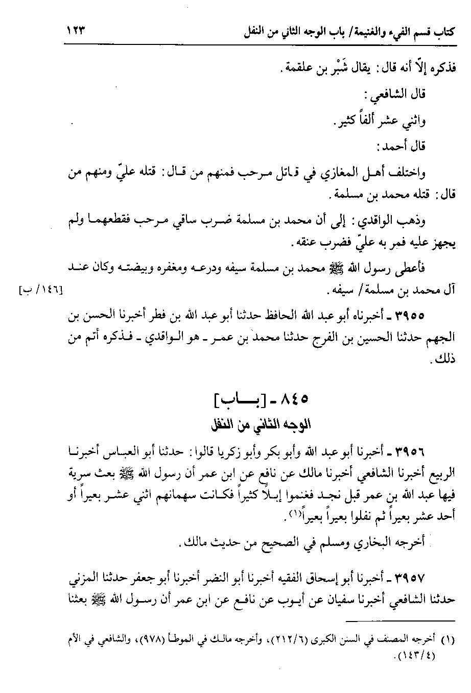 3956 - أخبرنا أبو عبد الله وأبو بكر وأبو زكريا قالوا : حدثنا أبو العباس أخبرنا الربيع أخبرنا الشافعي مالك عن نافع عن ابن عمر أن رسول الله صلى الله عليه وسلم بعث سرية فيها عبد الله بن عمر قبل نجد فغنموا إبلاً كثيراً فكانت سهمانهم اثني عشر بعيراً أو أحد عشر بعيراً ثم نفلوا بعيراً بعيراً.
