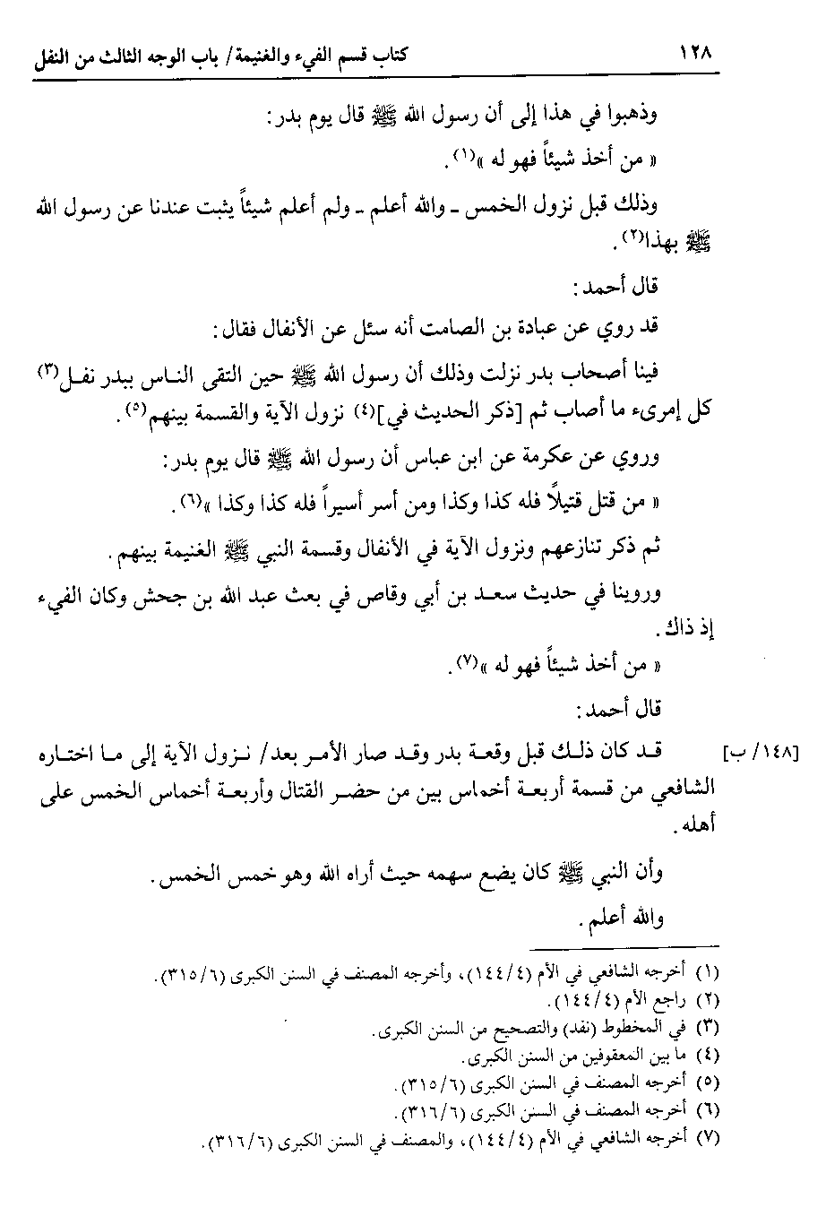 قال أحمد : قد كان ذلك قبل وقعة بدر وقد صار الأمر بعد نزول الآية إلى ما اختاره الشافعي من قسمة أربعة أخماس بين من حضر القتال وأربعة أخماس الخمس على أهله.