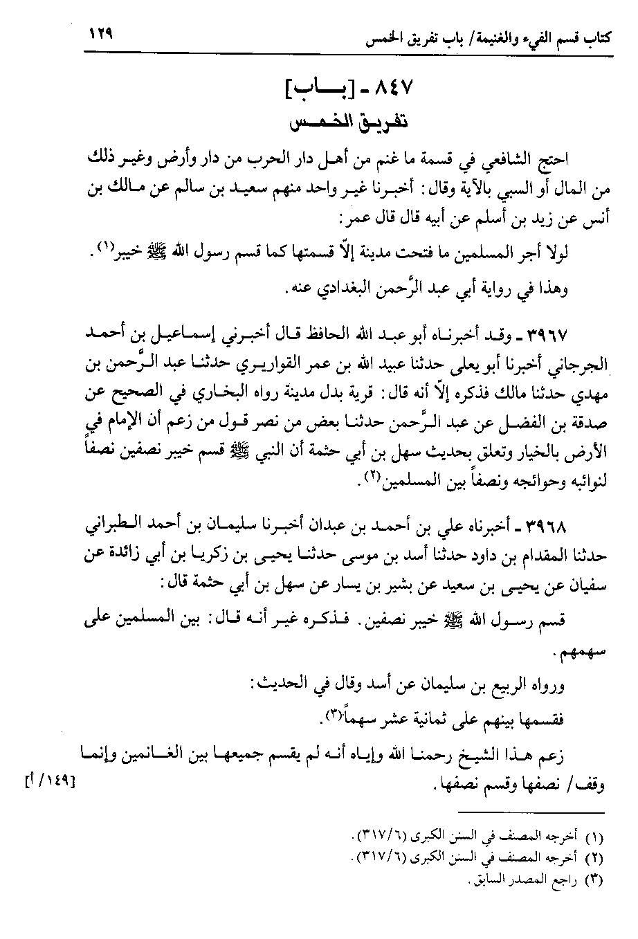 3968 - أخبرناه علي بن أحمد بن عبدان أخبرنا سليمان بن أحمد الطبراني حدثنا المقدام بن داود حدثنا أسد بن موسى حدثنا يحيى بن زكريا بن أبي زائدة عن سفيان عن يحيى بن سعيد عن بشير بن يسار عن سهل بن أبي خثمة قال قسم رسول الله صلى الله عليه وسلم خيبر نصفين . فذكره غير أنه قال : بين المسلمين على سهمهم.