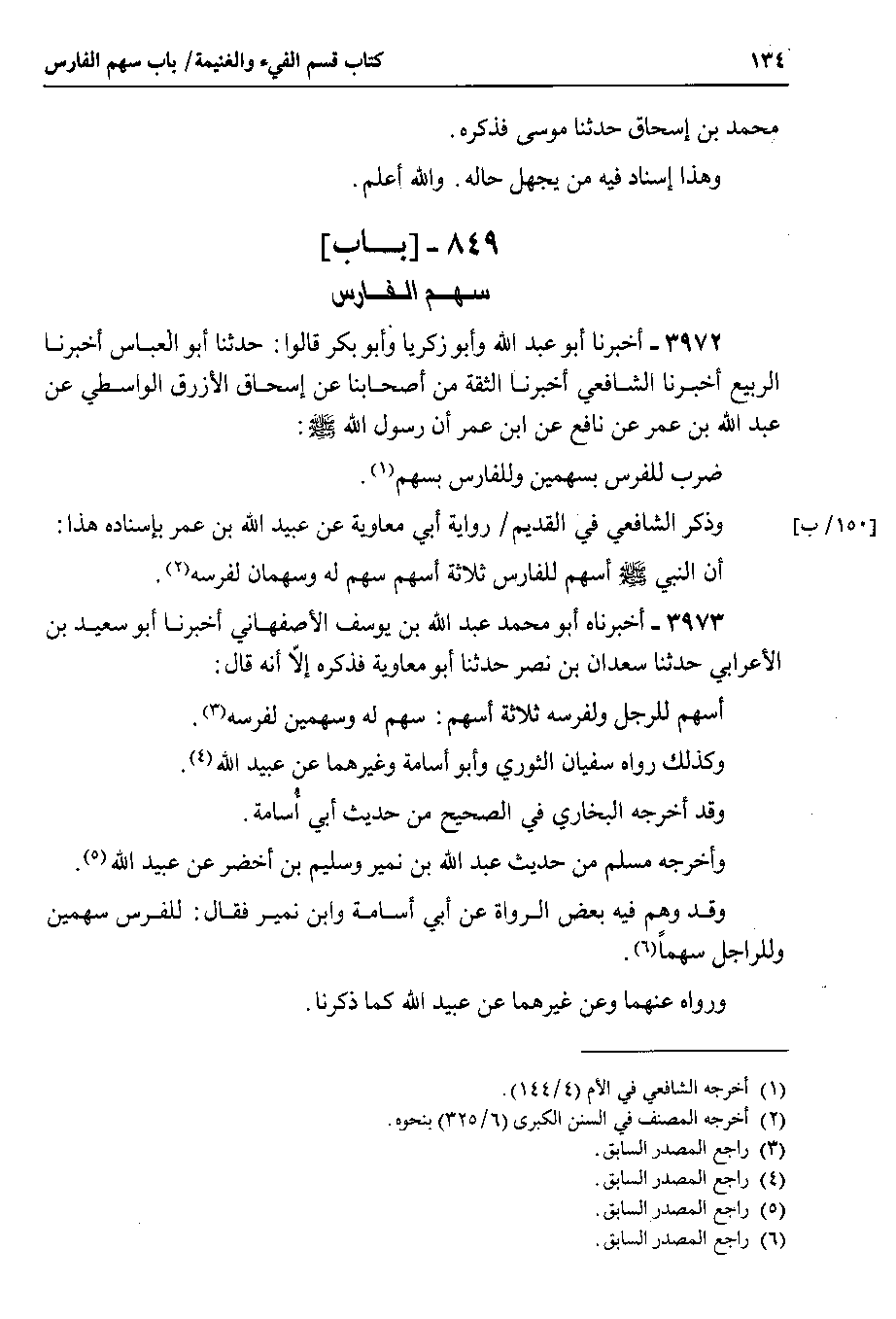 3972 - أخبرنا أبو عبد الله وأبو زكريا وأبو بكر قالوا : حدثنا أبو العباس أخبرنا الربيع أخبرنا الشافعي أخبرنا الثقة من أصحابنا عن إسحاق الأزرق الواسطي عن عبد الله بن عمر عن نافع عن ابن عمر أن رسول الله صلى الله عليه وسلم ضرب للفرس بسهمين وللفارس بسهم.