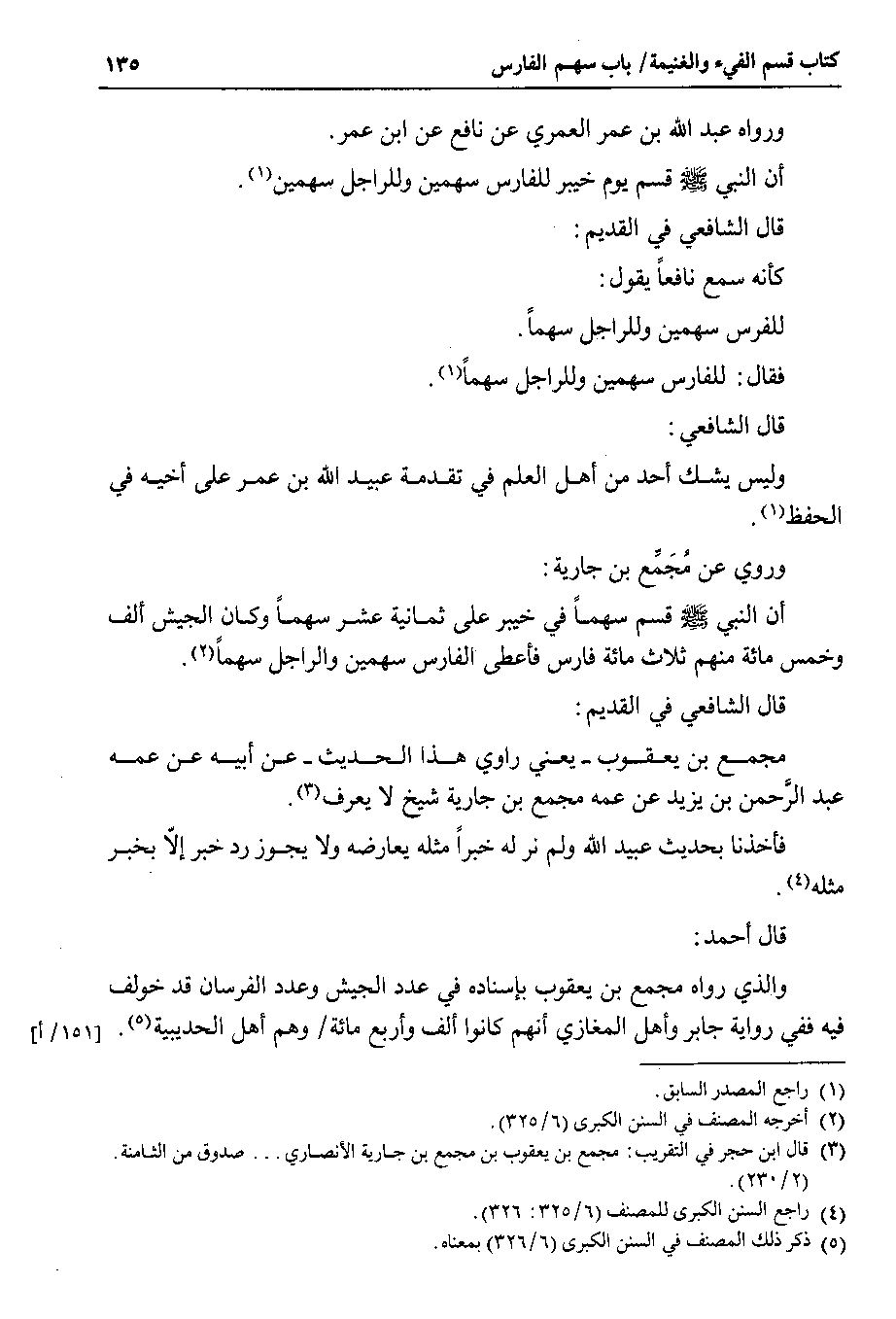 قال الشافعي في القديم كأنه سمع نافعاً يقول للفرس سهمين وللراجل سهماً.