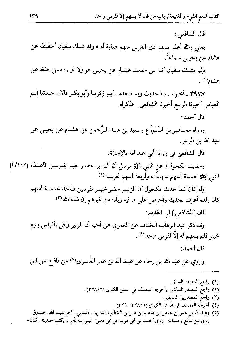 قال الشافعي في رواية أبي عبد الله بالإجازة وحديث مكحول عن النبي صلى الله عليه وسلم مرسل أن الزبير حضر خيبر بفرسين فأعطاه النبي صلى الله عليه وسلم خمسة أسهم سهماً له وأربعة أسهم لفرسيه.