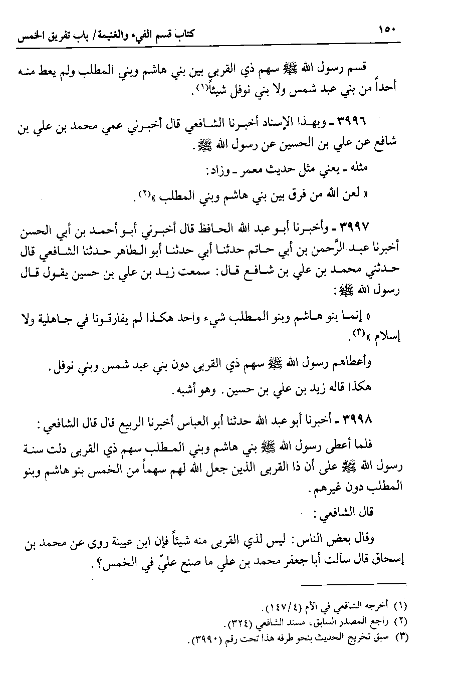 3998 - أخبرنا أبو عبد الله حدثنا أبو العباس أخبرنا الربيع قال قال الشافعي فلما أعطى رسول الله صلى الله عليه وسلم بني هاشم وبني المطلب سهم ذي القربى دلت سنة رسول الله صلى الله عليه وسلم على أن ذا القربى الذين جعل الله لهم سهماً من الخمس بنو هاشم وبنو المطلب دون غيرهم.