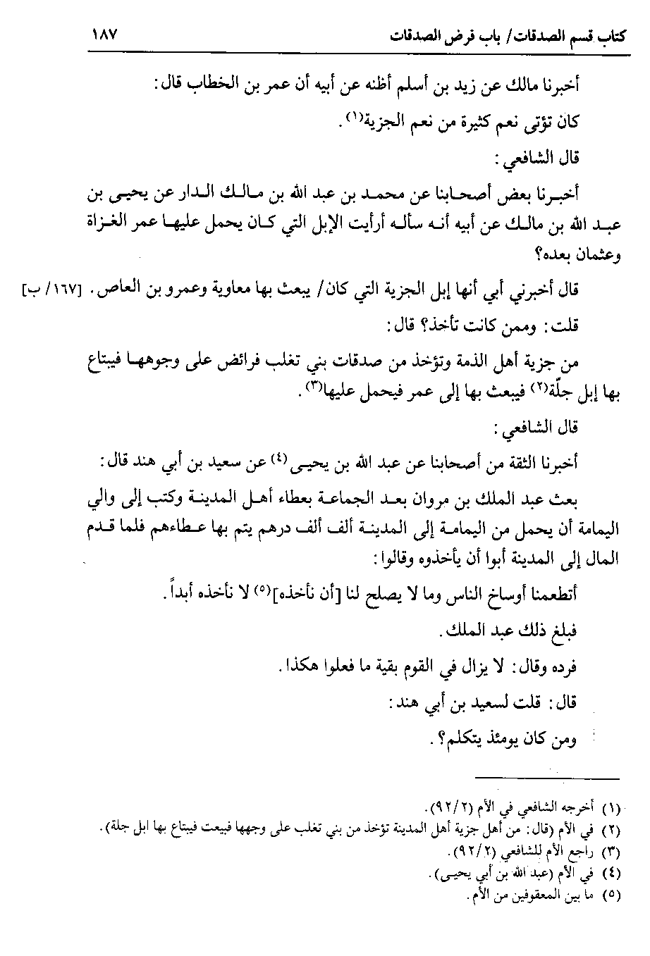 قال الشافعي أخبرنا بعض أصحابنا عن محمد بن عبد الله بن مالك الدار عن يحيى بن عبد الله بن مالك عن أبيه أنه سأله أرأيت الإبل التي كان يحمل عليها عمر الغزاة وعثمان بعده ؟ قال أخبرني أبي أنها إبل الجزية التي كان يبعث بها معاوية وعمرو بن العاص.