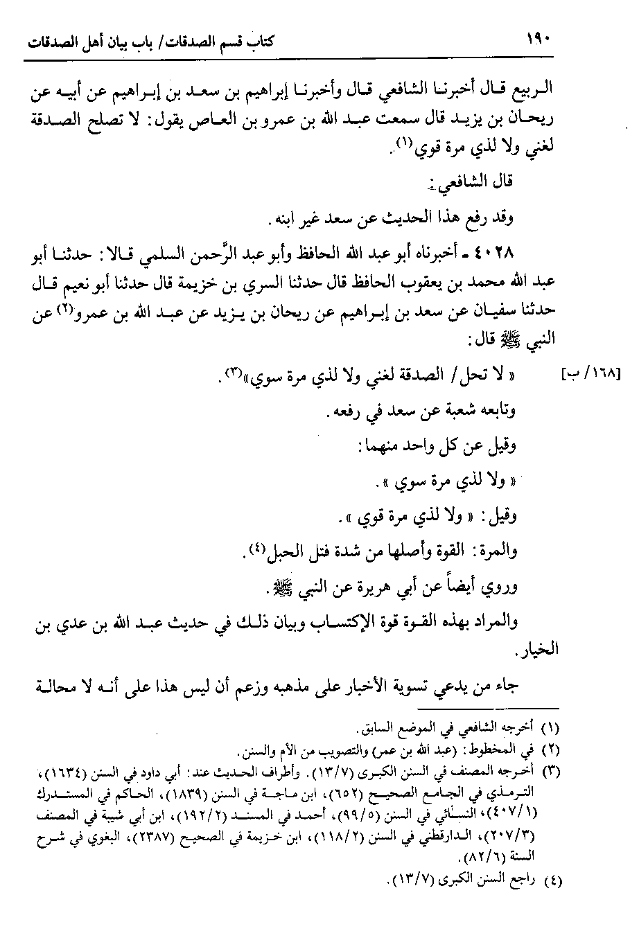 الربيع قال أخبرنا الشافعي قال وأخبرنا إبراهيم بن سعد بن إبراهيم عن أبيه عن ريحان بن يزيد قال سمعت عبد الله بن عمرو بن العاص يقول : لا تصلح الصدقة لغني ولا لذي مرة قوي.