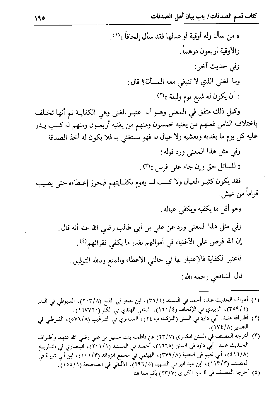 وكل ذلك متفق في المعنى وهو أنه اعتبر الغنى وهي الكفاية ثم أنها تختلف باختلاف الناس فمنهم من يغنيه خمسون ومنهم من يغنيه أربعون ومنهم له كسب يدر عليه كل يوم ما يغديه ويعشيه ولا عيال له فهو مستغني به فلا يكون له أخذ الصدقة.