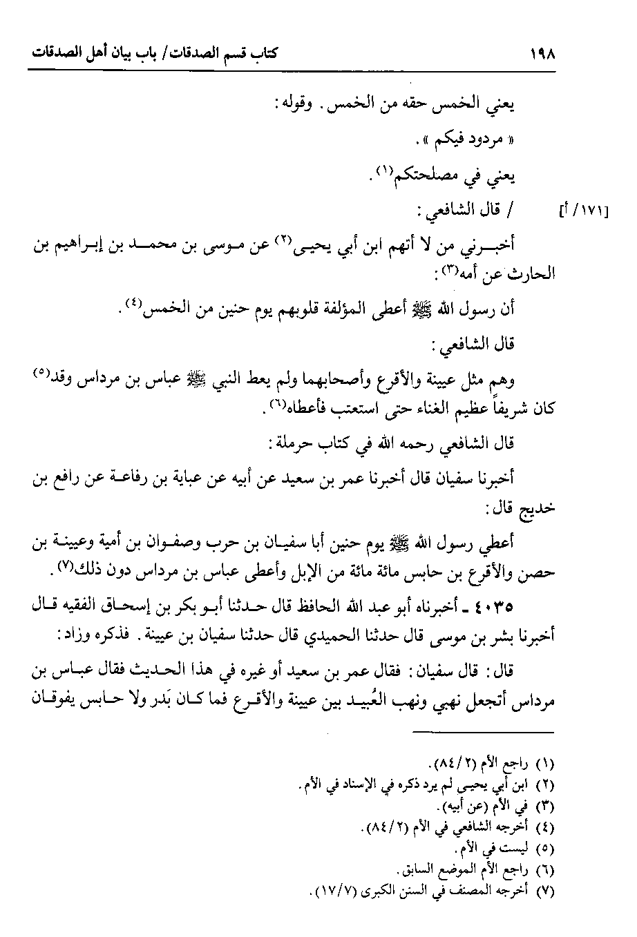 قال الشافعي رحمه الله في كتاب حرملة أخبرنا سفيان قال أخبرنا عمر بن سعيد عن أبيه عن عباية بن رفاعة عن رافع بن خديج قال أعطي رسول الله صلى الله عليه وسلم يوم حنين أبا سفيان بن حرب وصفوان بن أمية وعيينة بن حصن والأقرع بن حابس مِئَة مِئَة من الإبل وأعطى عباس بن مرداس دون ذلك.