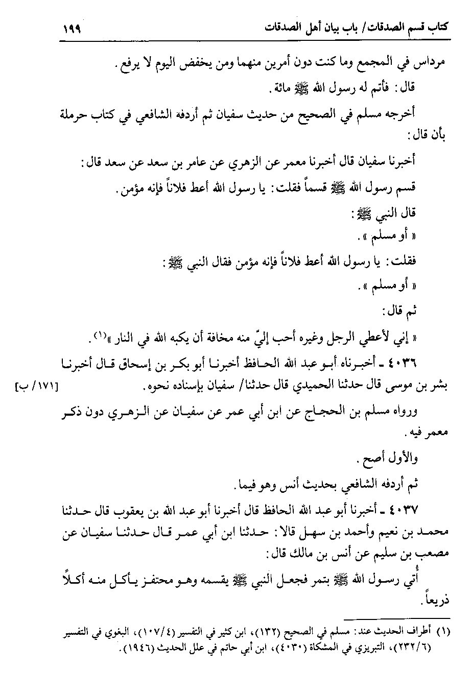 أخرجه مسلم في الصحيح من حديث سفيان ثم أردفه الشافعي في كتاب حرملة بأن قال أخبرنا سفيان قال أخبرنا معمر عن الزهري عن عامر بن سعد عن سعد قال قسم رسول الله صلى الله عليه وسلم قسماً فقلت : يا رسول الله أعط فلاناً فإنه مؤمن.