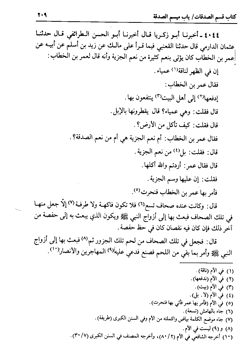 4044 - أخبرنا أبو زكريا قال أخبرنا أبو الحسن الطرائفي قال حدثنا عثمان الدارمي قال حدثنا القعنبي فيما قرأ على مالك عن زيد بن أسلم عن أبيه عن عمر بن الخطاب كان يؤتى بنعم كثيرة من نعم الجزية وأنه قال لعمر بن الخطاب إن في الظهر لناقة عمياء.
