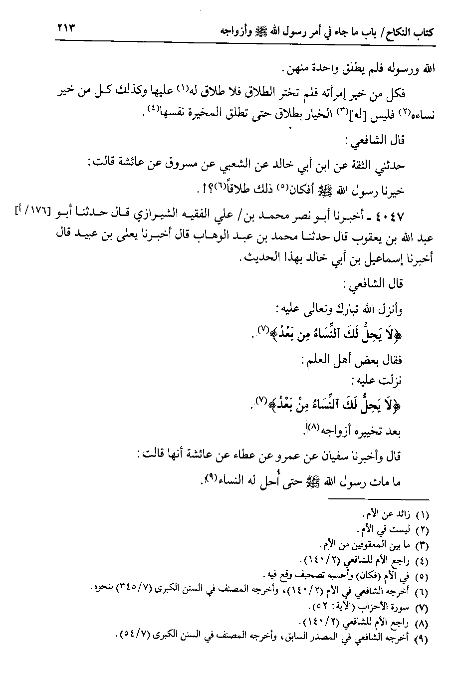 قال الشافعي حدثني الثقة عن ابن أبي خالد عن الشعبي عن مسروق عن عائشة قالت خيرنا رسول الله صلى الله عليه وسلم أفكان ذلك طلاقاً ؟ !.
