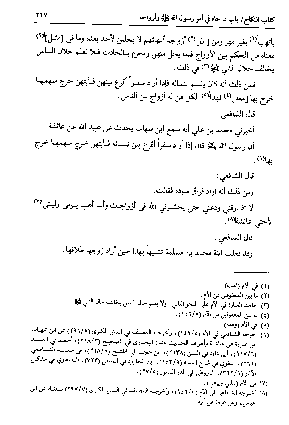 قال الشافعي ومن ذلك أنه أراد فراق سودة فقالت لا تفارقني ودعني حتى يحشرني الله في أزواجك وأنا أهب يومي وليلتي لأختي عائشة.