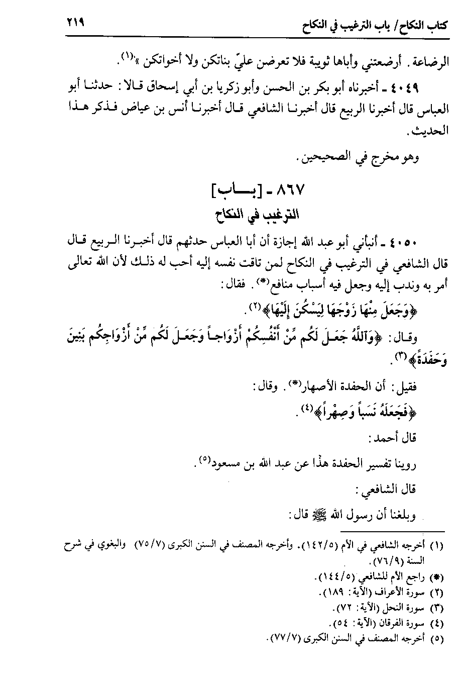 4050 - أنبأني أبو عبد الله إجازة أن أبا العباس حدثهم قال أخبرنا الربيع قال قال الشافعي في الترغيب في النكاح لمن تاقت نفسه إليه أحب له ذلك لأن الله تعالى أمر به وندب إليه وجعل فيه أسباب منافع . فقال {وجعل منها زوجها ليسكن إليها}.