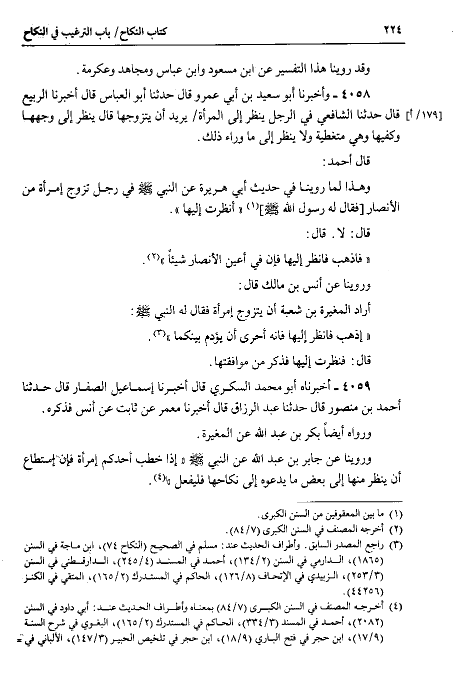 4058 - وأخبرنا أبو سعيد بن أبي عمرو قال حدثنا أبو العباس قال أخبرنا الربيع قال حدثنا الشافعي في الرجل ينظر إلى المرأة يريد أن يتزوجها قال ينظر إلى وجهها وكفيها وهي متغطية ولا ينظر إلى ما وراء ذلك.