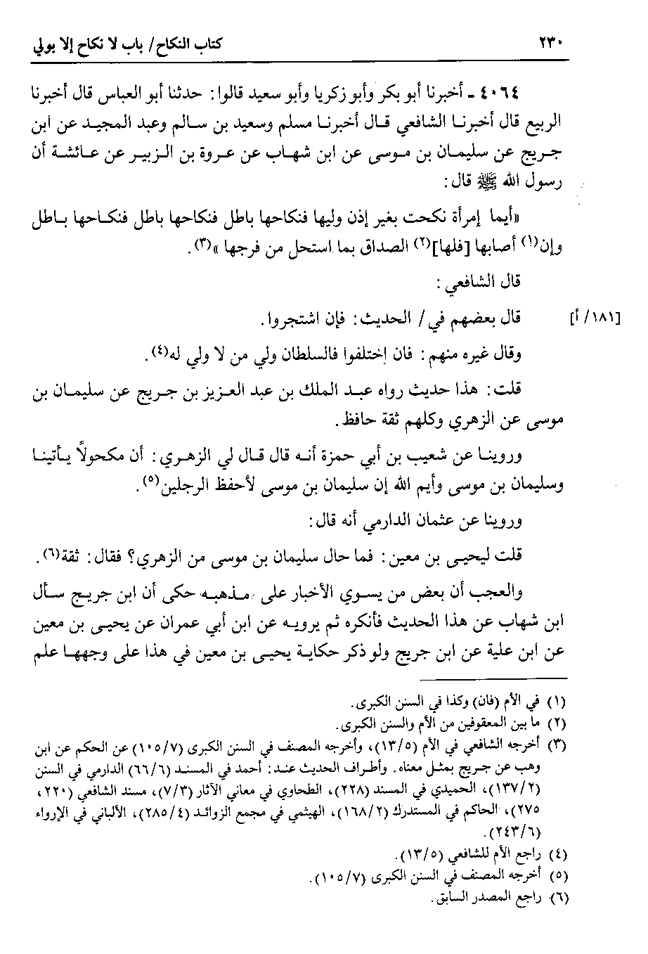 4064 - أخبرنا أبو بكر وأبو زكريا وأبو سعيد قالوا : حدثنا أبو العباس قال أخبرنا الربيع قال أخبرنا الشافعي قال أخبرنا مسلم وسعيد بن سالم وعبد المجيد عن ابن جريج عن سليمان بن موسى عن ابن شهاب عن عروة بن الزبير عن عائشة أن رسول الله صلى الله عليه وسلم قال : أيما امرأة نكحت بغير إذن وليها فنكاحها باطل فنكاحها باطل فنكاحها باطل وإن أصابها فلها الصداق بما استحل من فرجها.