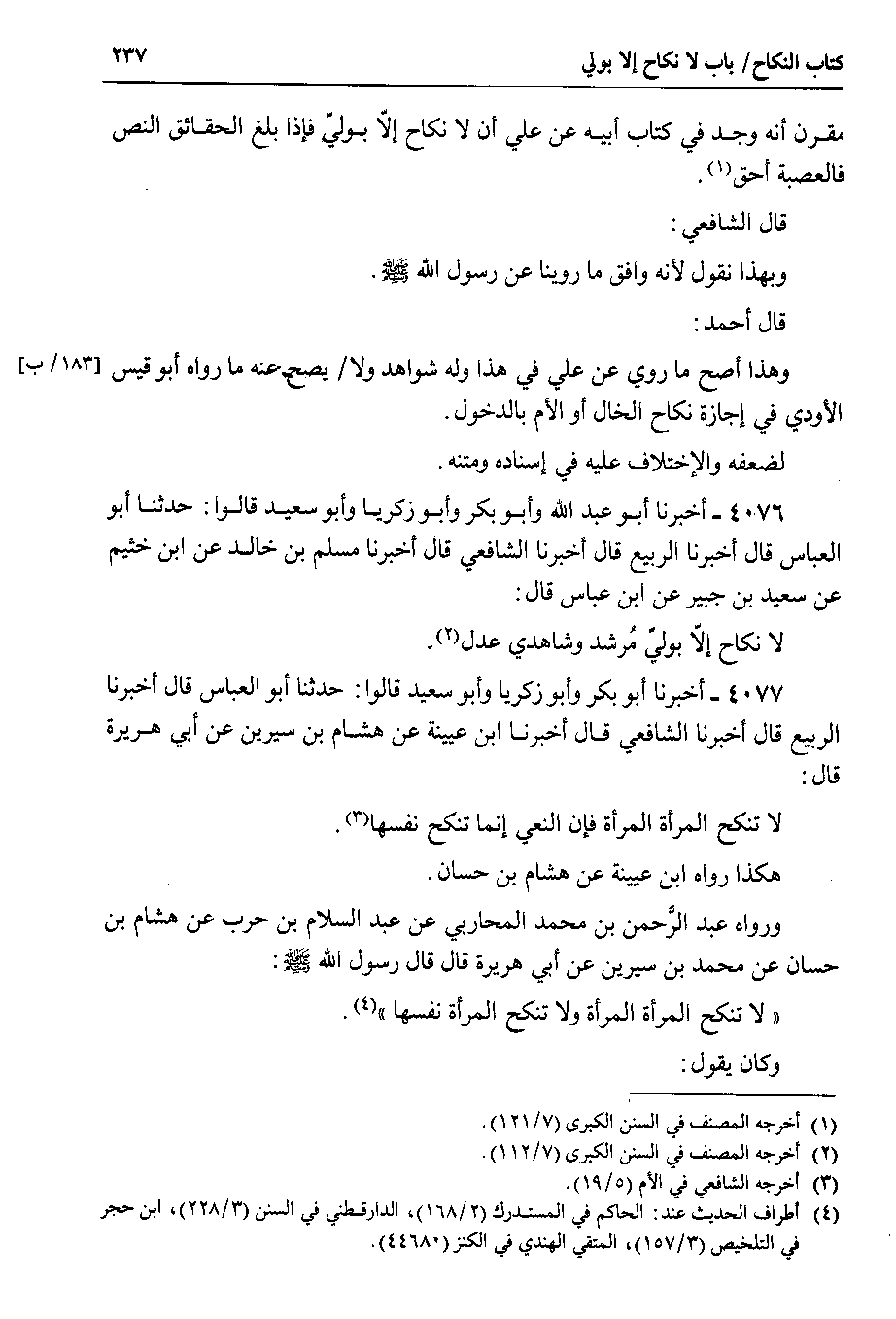4076 - أخبرنا أبو عبد الله وأبو بكر وأبو زكريا وأبو سعيد قالوا : حدثنا أبو العباس قال أخبرنا الربيع قال أخبرنا الشافعي قال أخبرنا مسلم بن خالد عن ابن خثيم عن سعيد بن جبير عن ابن عباس قال لا نكاح إلا بولي مرشد وشاهدي عدل.