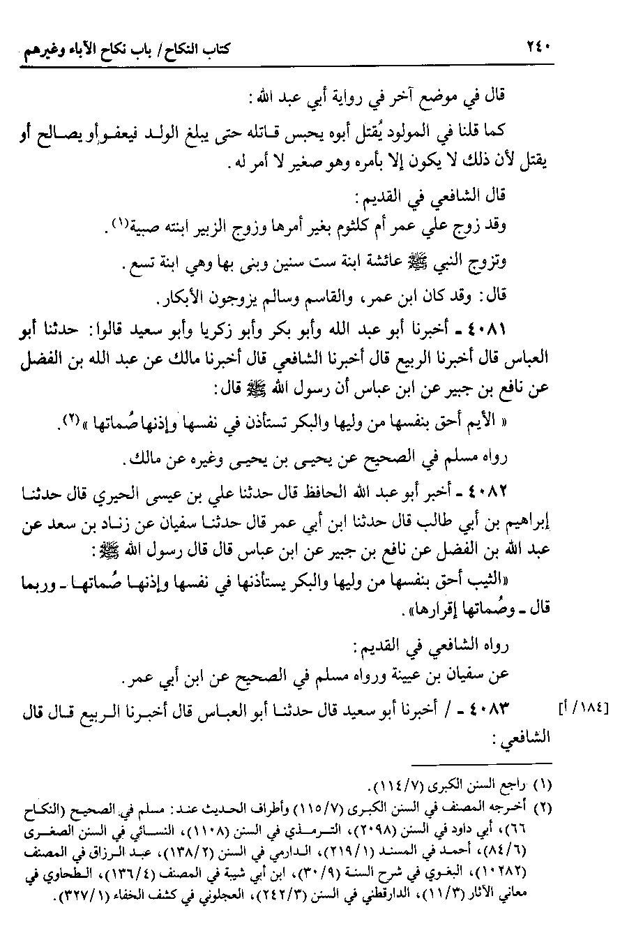 4081 - أخبرنا أبو عبد الله وأبو بكر وأبو زكريا وأبو سعيد قالوا : حدثنا أبو العباس قال أخبرنا الربيع قال أخبرنا الشافعي قال أخبرنا مالك عن عبد الله بن الفضل عن نافع بن جبير عن ابن عباس أن رسول الله صلى الله عليه وسلم قال الأيم أحق بنفسها من وليها والبكر تستأذن في نفسها وإذنها صماتها.