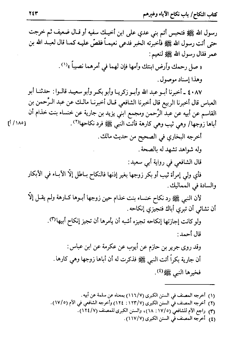 4087 - أخبرنا أبو عبد الله وأبو زكريا وأبو بكر وأبو سعيد قالوا : حدثنا أبو العباس قال أخبرنا الربيع قال أخبرنا الشافعي قال أخبرنا مالك عن عبد الرحمن بن القاسم عن أبيه عن عبد الرحمن ومجمع ابني يزيد بن جارية عن خنساء بنت خذام أن أباها زوجها وهي ثيب وهي كارهة فأتت رسول الله صلى الله عليه وسلم فرد نكاحها.