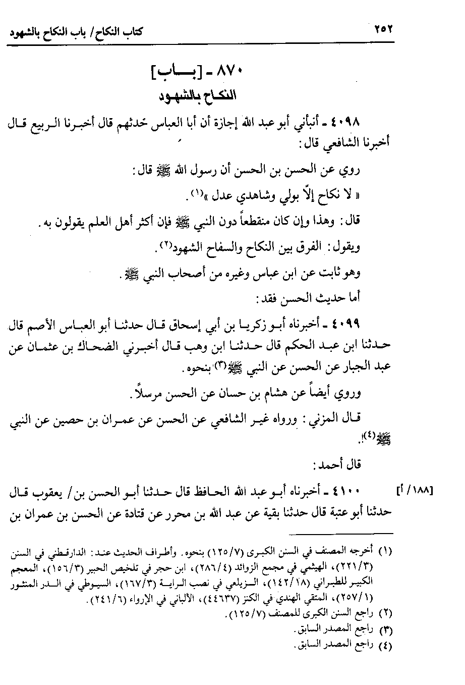 4098 - أنبأني أبو عبد الله إجازة أن أبا العباس حدثهم قال أخبرنا الربيع قال أخبرنا الشافعي قال روي عن الحسن بن الحسن أن رسول الله صلى الله عليه وسلم قال لا نكاح إلا بولي وشاهدي عدل.