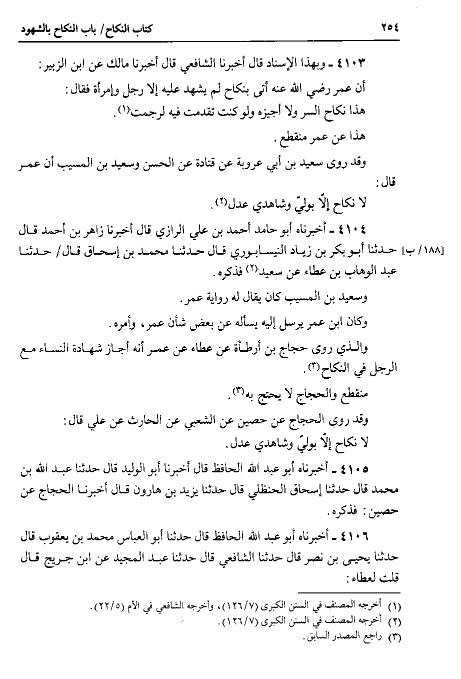 4103 - وبهذا الإسناد قال أخبرنا الشافعي قال أخبرنا مالك عن ابن الزبير أن عمر رضي الله عنه أتى بنكاح لم يشهد عليه إلا رجل وامرأة فقال هذا نكاح السر ولا أجيزه ولو كنت تقدمت فيه لرجمت.