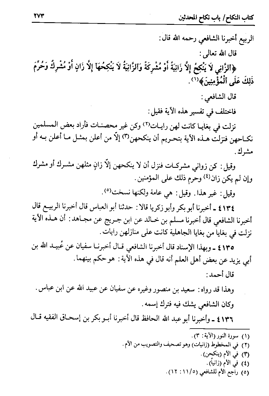 الربيع أخبرنا الشافعي رحمه الله قال قال الله تعالى {الزاني لا ينكح إلا زانية أو مشركة والزانية لا ينكحها إلا زان أو مشرك وحرم ذلك على المؤمنين}.