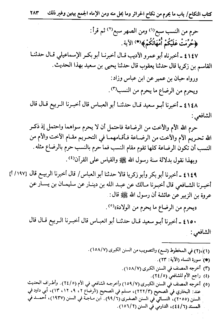 4148 - أخبرنا أبو سعيد قال حدثنا أبو العباس قال أخبرنا الربيع قال قال الشافعي حرم الله الأم والأخت من الرضاعة فاحتمل أن لا يحرم سواهما واحتمل إذ ذكر الله تحريم الأم والأخت من الرضاعة فأقامهما في التحريم مقام الأخت والأم من النسب أن تكون الرضاعة كلها تقوم مقام النسب فما حرم بالنسب حرم بالرضاع مثله.