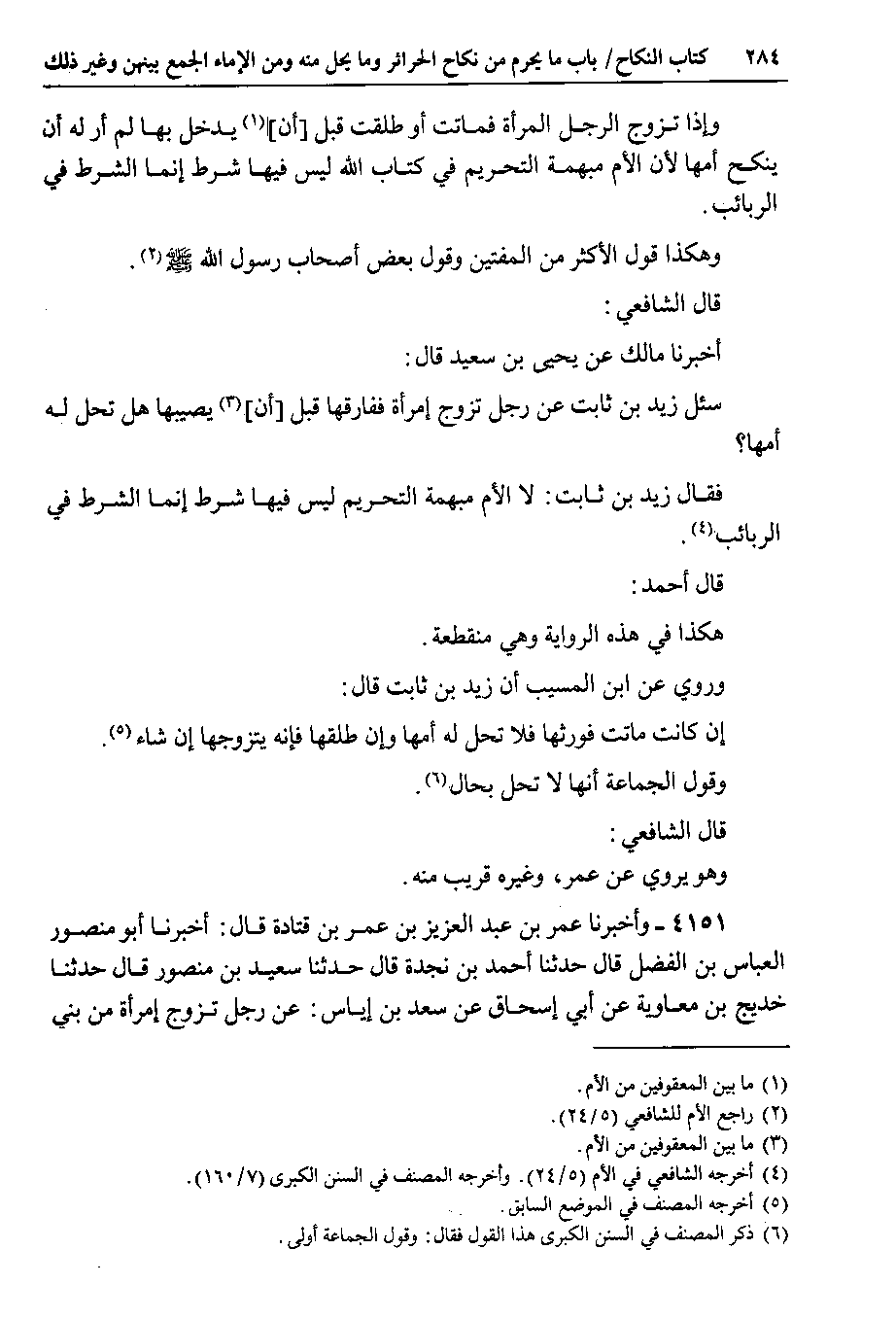 قال الشافعي أخبرنا مالك عن يحيى بن سعيد قال سئل زيد بن ثابت عن رجل تزوج امرأة ففارقها قبل أن يصيبها هل تحل له أمها ؟ فقال زيد بن ثابت : لا الأم مبهمة التحريم ليس فيها شرط إنما الشرط في الربائب.