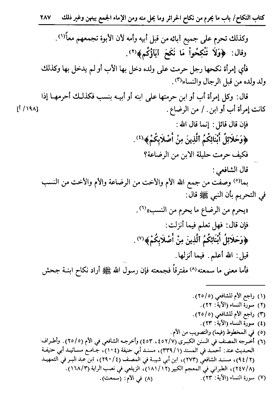 فإن قال قائل : إنما قال الله {وحلائل أبنائكم الذين من أصلابكم} فكيف حرمت حليلة الابن من الرضاعة ؟ قال الشافعي بما وصفت من جمع الله الأم والأخت من الرضاعة والأم والأخت من النسب في التحريم بأن النبي صلى الله عليه وسلم قال يحرم من الرضاع ما يحرم من النسب.