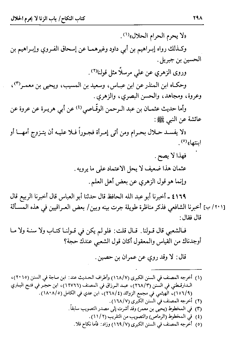 4169 - أخبرنا أبو عبد الله الحافظ قال حدثنا أبو العباس قال أخبرنا الربيع قال أخبرنا الشافعي فذكر مناظرة طويلة جرت بينه وبين بعض العراقيين في هذه المسألة قال فقال فالشعبي قال قولنا . قال قلت : فلو لم يكن في قولنا كتاب ولا سنة ولا ما أوجدناك من القياس والمعقول أكان قول الشعبي عندك حجة ؟ قال : لا وقد روي عن عمران بن حصين.