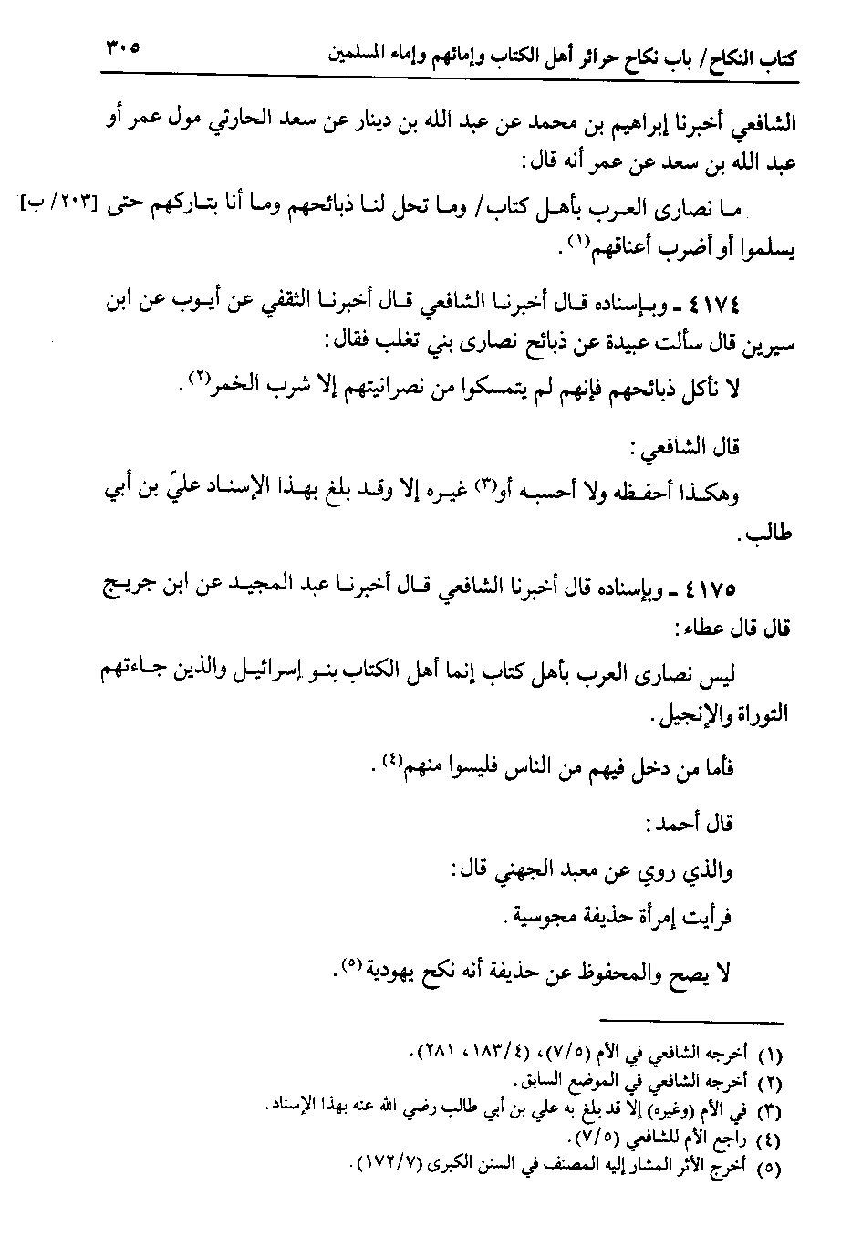 الشافعي أخبرنا إبراهيم بن محمد عن عبد الله بن دينار عن سعد الحارثي مول عمر أو عبد الله بن سعد عن عمر أنه قال ما نصارى العرب بأهل كتاب وما تحل لنا ذبائحهم وما أنا بتاركهم حتى يسلموا أو أضرب أعناقهم.