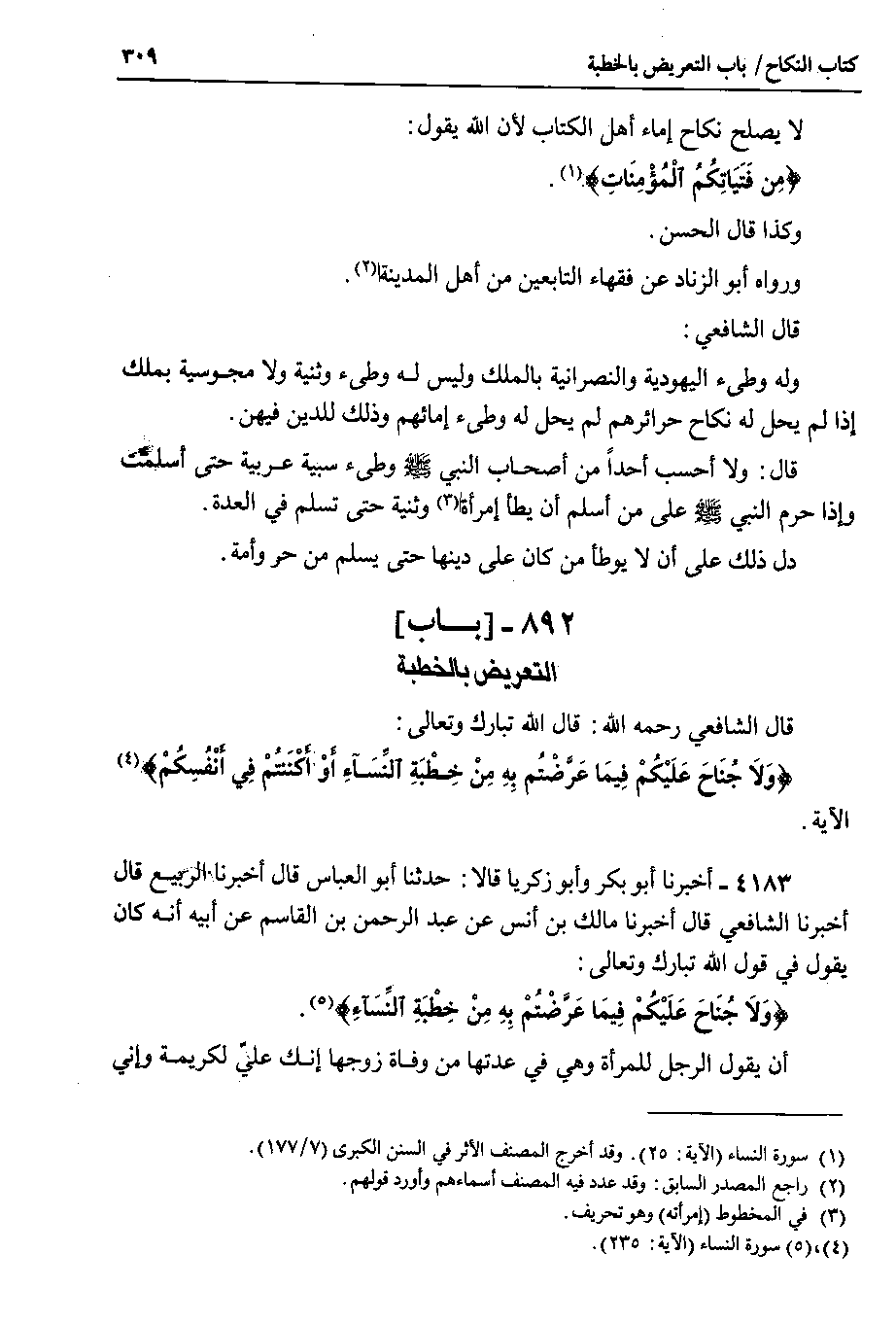 قال الشافعي رحمه الله : قال الله تبارك وتعالى {ولا جناح عليكم فيما عرضتم به من خطبة النساء أو أكننتم في أنفسكم} الأية.