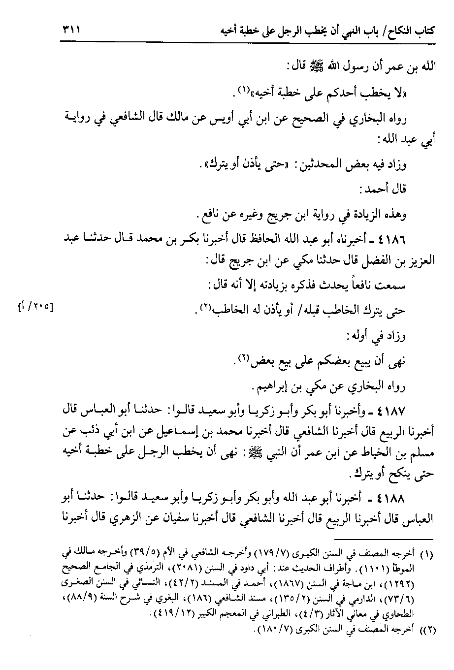 4187 - وأخبرنا أبو بكر وأبو زكريا وأبو سعيد قالوا : حدثنا أبو العباس قال أخبرنا الربيع قال أخبرنا الشافعي قال أخبرنا محمد بن إسماعيل عن ابن أبي ذئب عن مسلم بن الخياط عن ابن عمر أن النبي صلى الله عليه وسلم : نهى أن يخطب الرجل على خطبة أخيه حتى ينكح أو يترك.