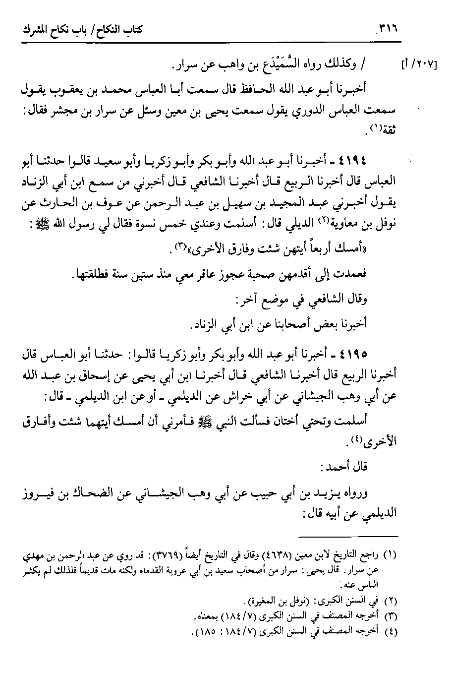4194 - أخبرنا أبو عبد الله وأبو بكر وأبو زكريا وأبو سعيد قالوا حدثنا أبو العباس قال أخبرنا الربيع قال أخبرنا الشافعي قال أخبرني من سمع ابن أبي الزناد يقول أخبرني عبد المجيد بن سهيل بن عبد الرحمن عن عوف بن الحارث عن نوفل بن معاوية الديلي قال : أسلمت وعندي خمس نسوة فقال لي رسول الله صلى الله عليه وسلم أمسك أربعاً أيتهن شئت وفارق الأخرى.