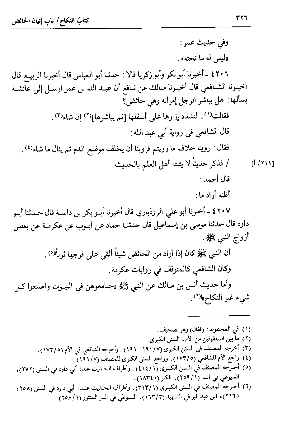 4206 - أخبرنا أبو بكر وأبو زكريا قالا : حدثنا أبو العباس قال أخبرنا الربيع قال أخبرنا الشافعي قال أخبرنا مالك عن نافع أن عبد الله بن عمر أرسل إلى عائشة يسألها : هل يباشر الرجل امرأته وهي حائض ؟ فقالت : لتشدد إزارها على أسفلها ثم يباشرها إن شاء.