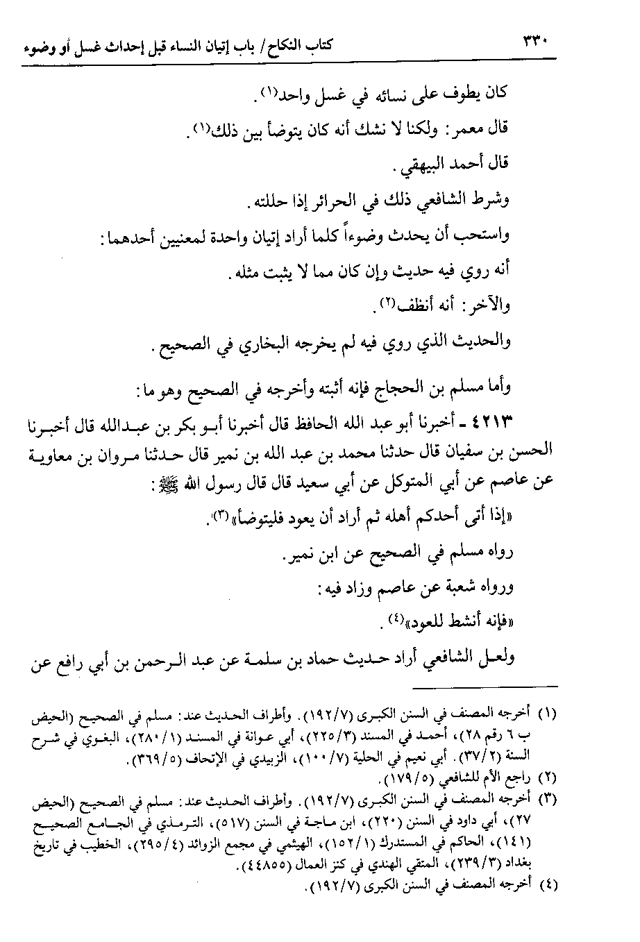 وأما مسلم بن الحجاج فإنه أثبته وأخرجه في الصحيح وهو ما 4213 - أخبرنا أبو عبد الله الحافظ قال أخبرنا أبو بكر بن عبد الله قال أخبرنا الحسن بن سفيان قال حدثنا محمد بن عبد الله بن نمير قال حدثنا مروان بن معاوية عن عاصم عن أبي المتوكل عن أبي سعيد قال قال رسول الله صلى الله عليه وسلم : إذا أتى أحدكم أهله ثم أراد أن يعود فليتوضأ.