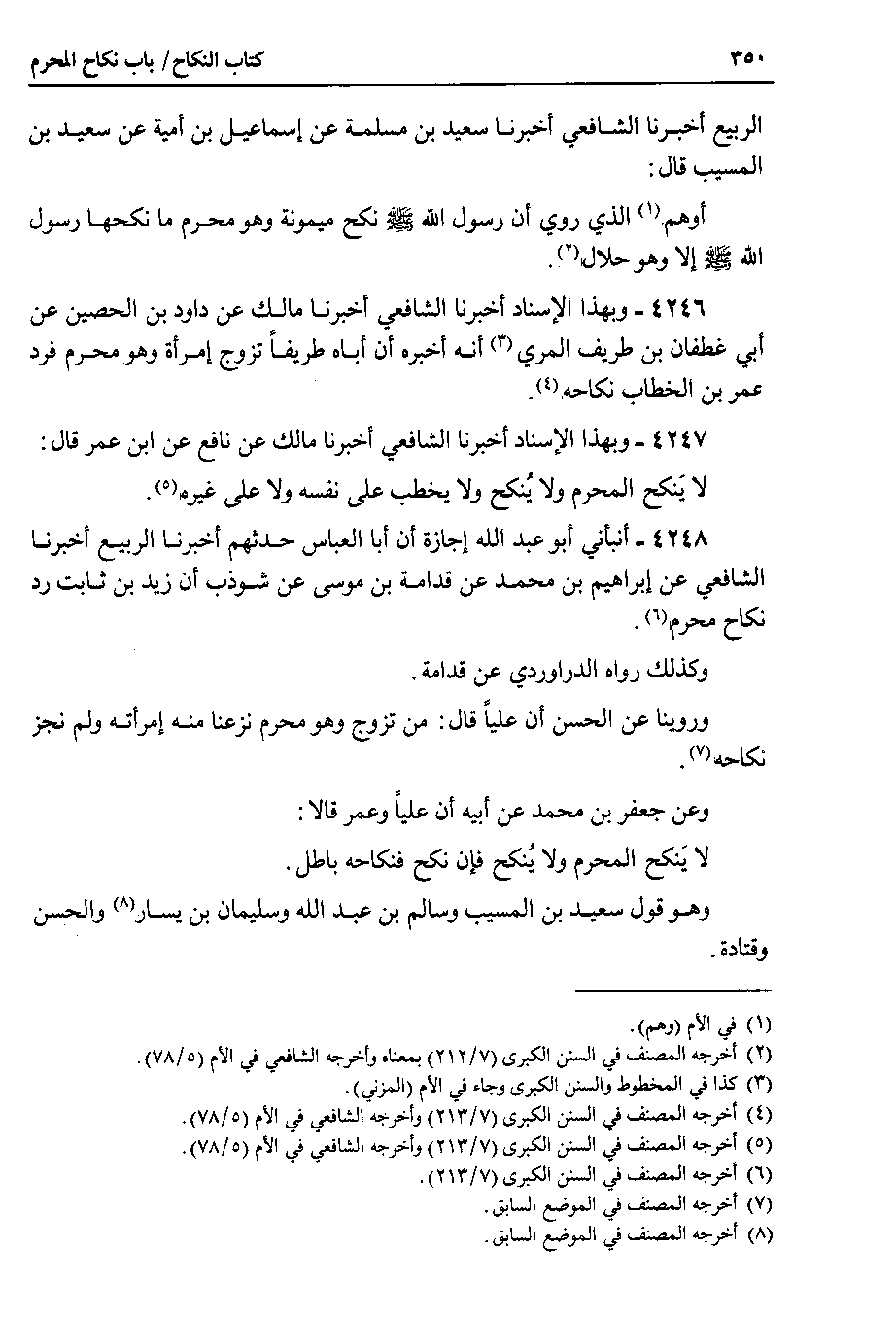 4248 - أنبأني أبو عبد الله إجازة أن أبا العباس حدثهم أخبرنا الربيع أخبرنا الشافعي عن إبراهيم بن محمد عن قدامة بن موسى عن شوذب أن زيد بن ثابت رد نكاح محرم.